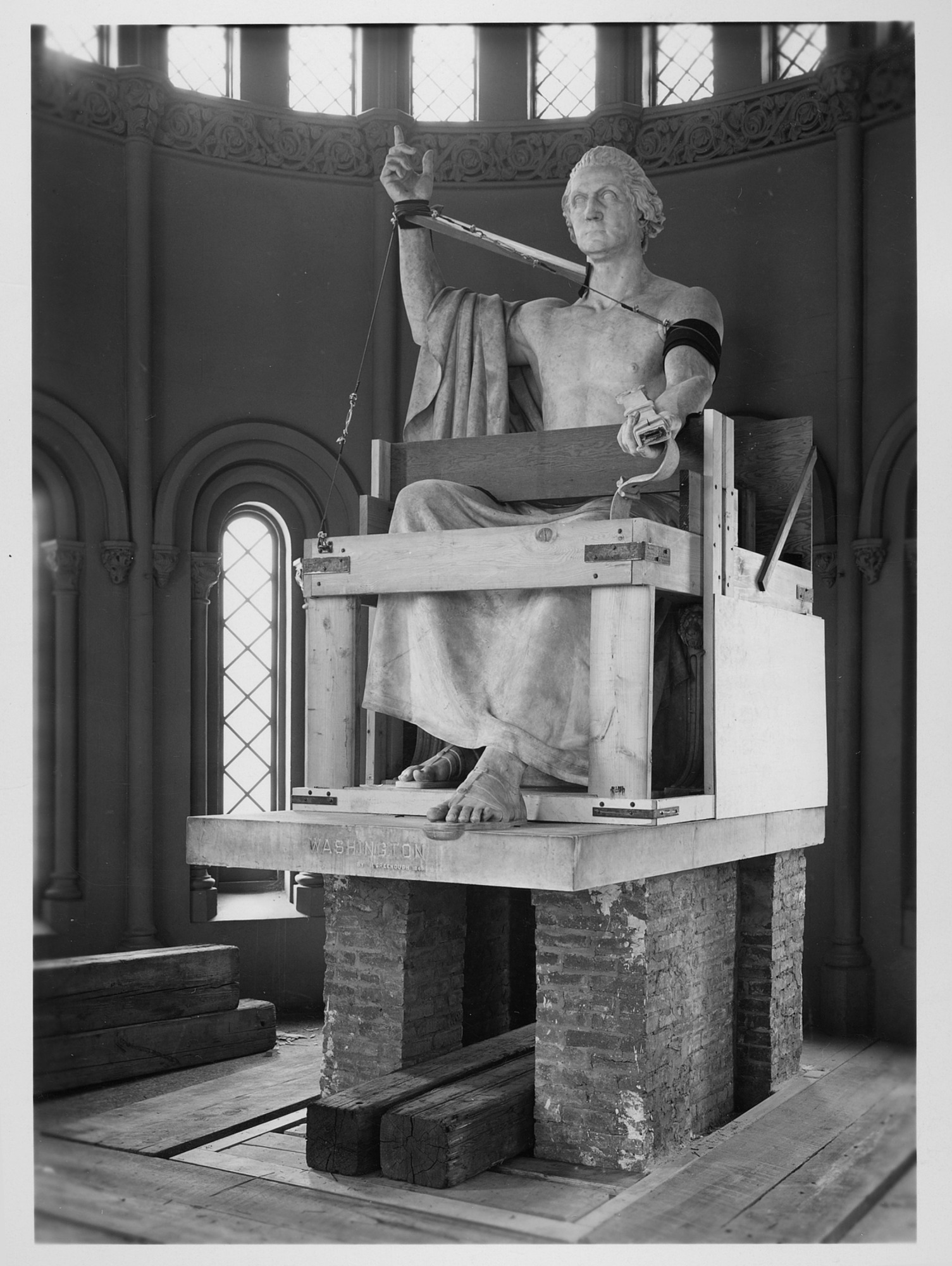 The statue of George Washington, sculpted by Horatio Greenough, has been raised off the floor and placed on bricks in preparation for its removal from the West Wing of the Smithsonian Institution Building. The statue was moved out of the building on September 6, 1962. The statue had been housed at the U.S. Capitol after its creation and in 1908 was transferred to the Smithsonian.