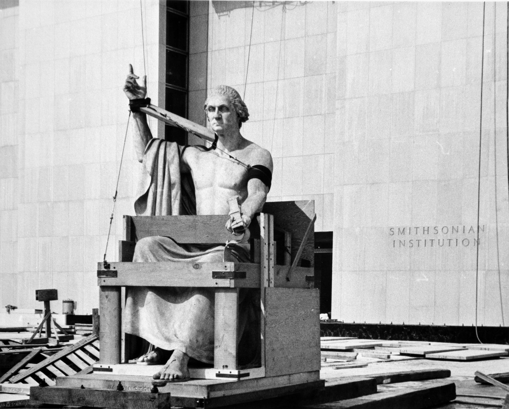 George Washington statue, sculpted by Horatio Greenough, encased in its support system sits outside the Museum of History and Technology, now the National Museum of American History, waiting to be moved inside. The statue was moved into the building before construction was completed.