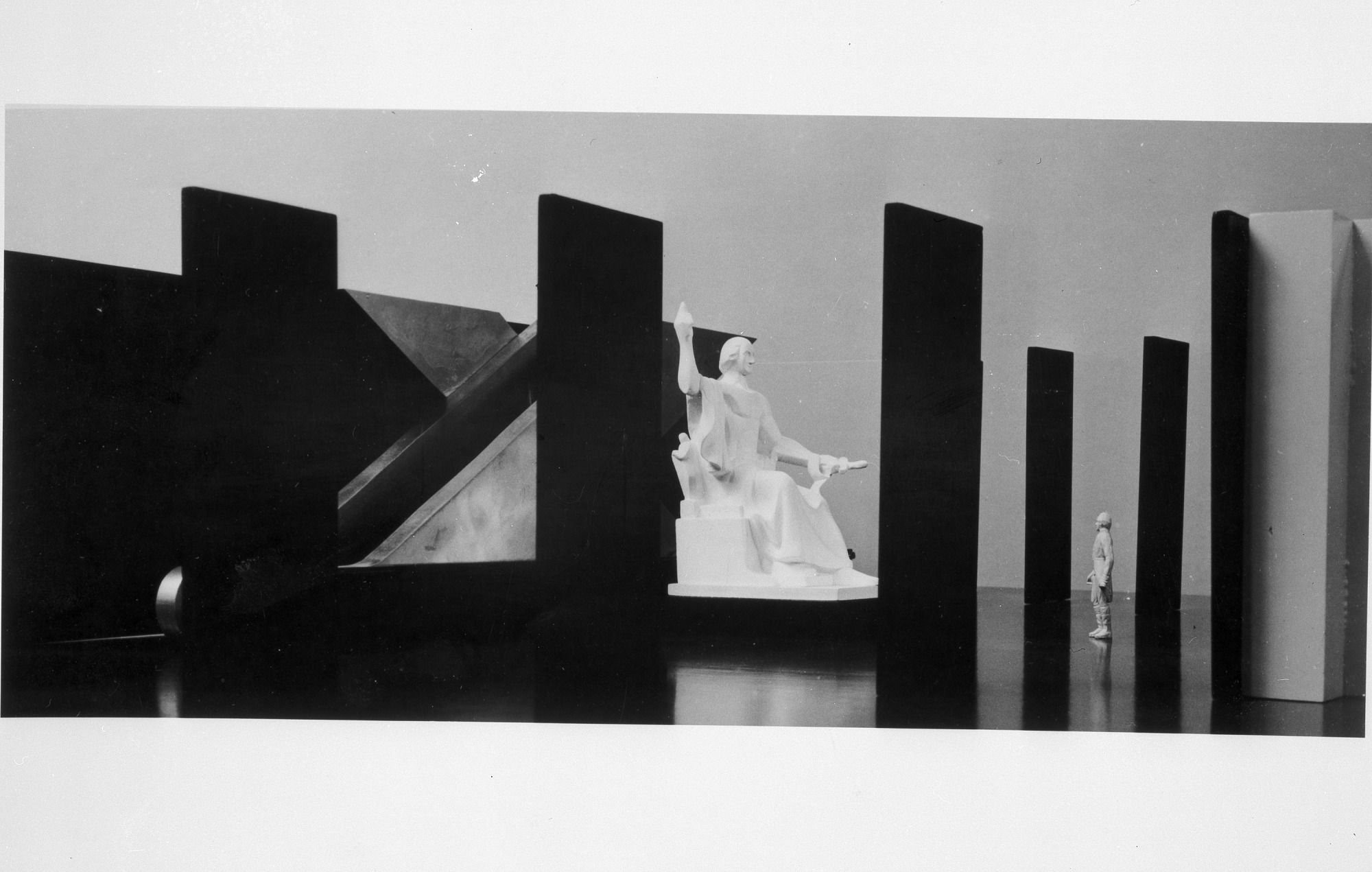An early model of the interior space of the Museum of History and Technology, now the National Museum of American History, has a model of the statue, sculpted by Horatio Greenough, of George Washington sitting in its place in front of the escalators.