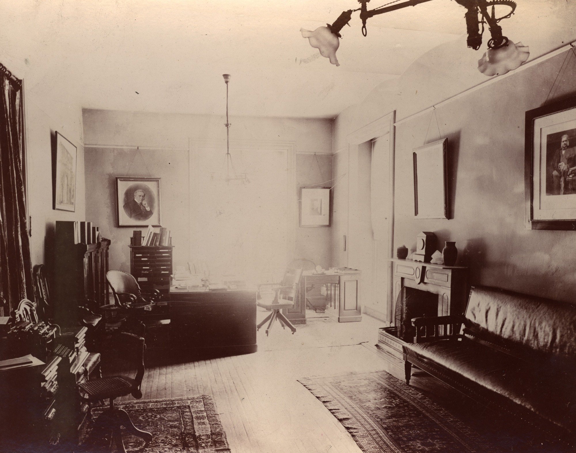 Identified as an office in the Smithsonian Institution Building (SIB) or "Castle," the room has a fireplace, sofa, secretary's desk with typewriter and other furniture. Pictures on walls include one of Joseph Henry, first Secretary of the Smithsonian.