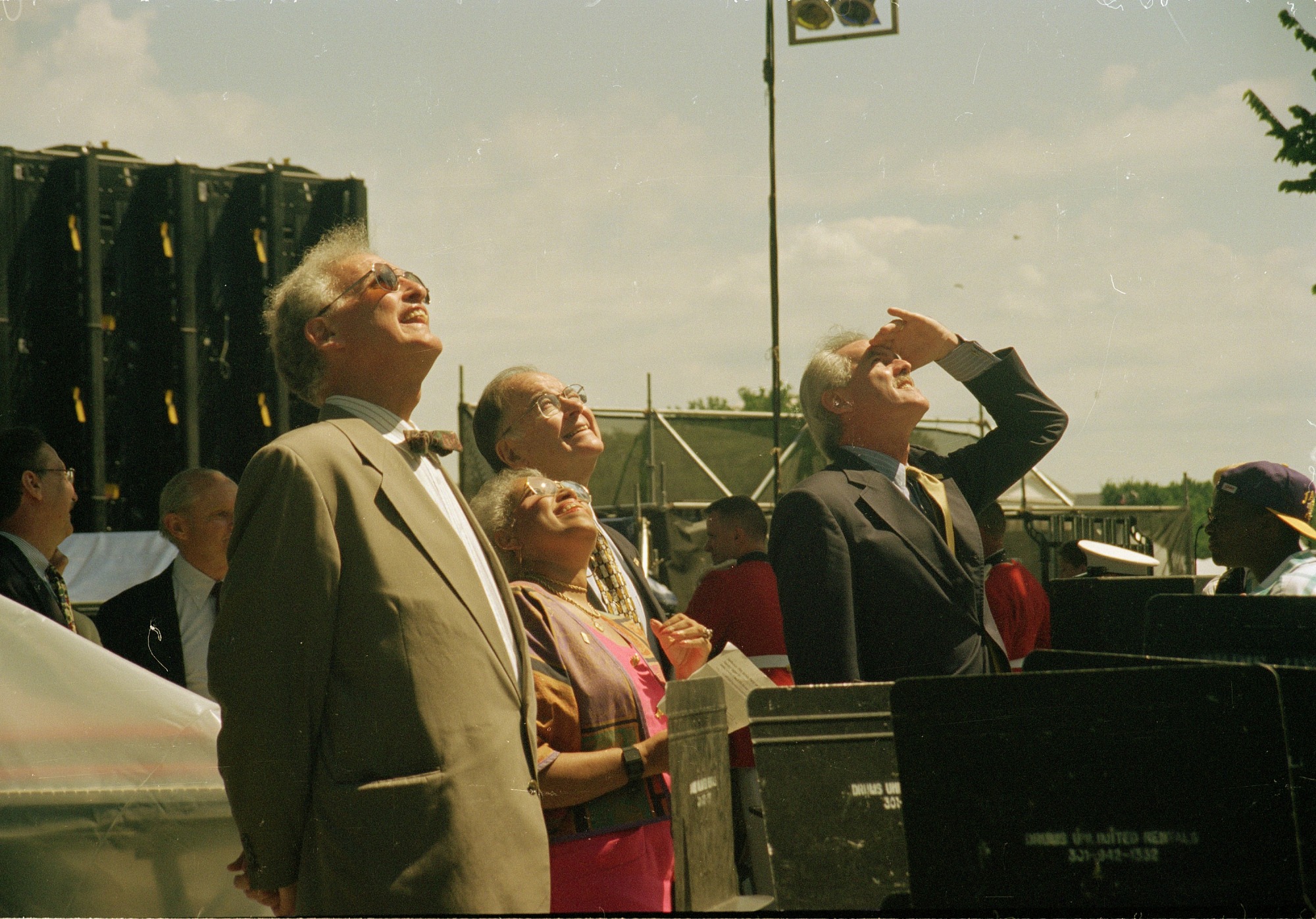 Secretary I. Michael Heyman and others look upward as the new bell is being lifted to the top of the Flag Tower of the Smithsonian Institution Building on August 10, 1996 on the 150th Anniversary of the founding of the Smithsonian Institution.