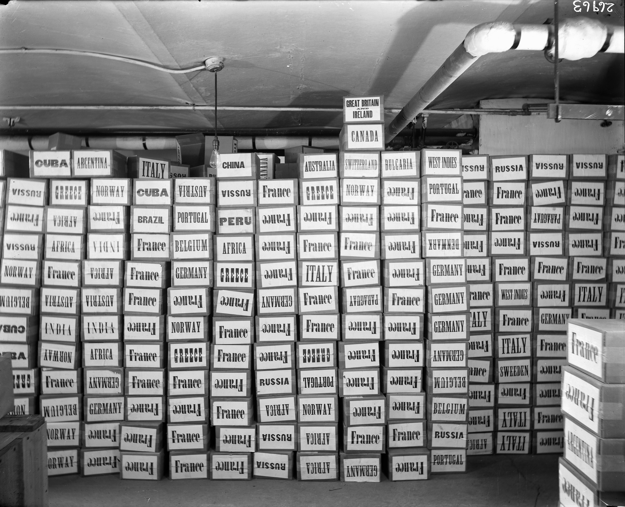 In the basement of the Smithsonian Institution Building, stacks of packages of publications labeled with the foreign country to receive the shipment have been prepared by the International Exchange Service. Established in 1848, the International Exchange Service, administered by the Smithsonian Institution, disseminated scientific publications to scholarly institutions both in the United States and abroad.