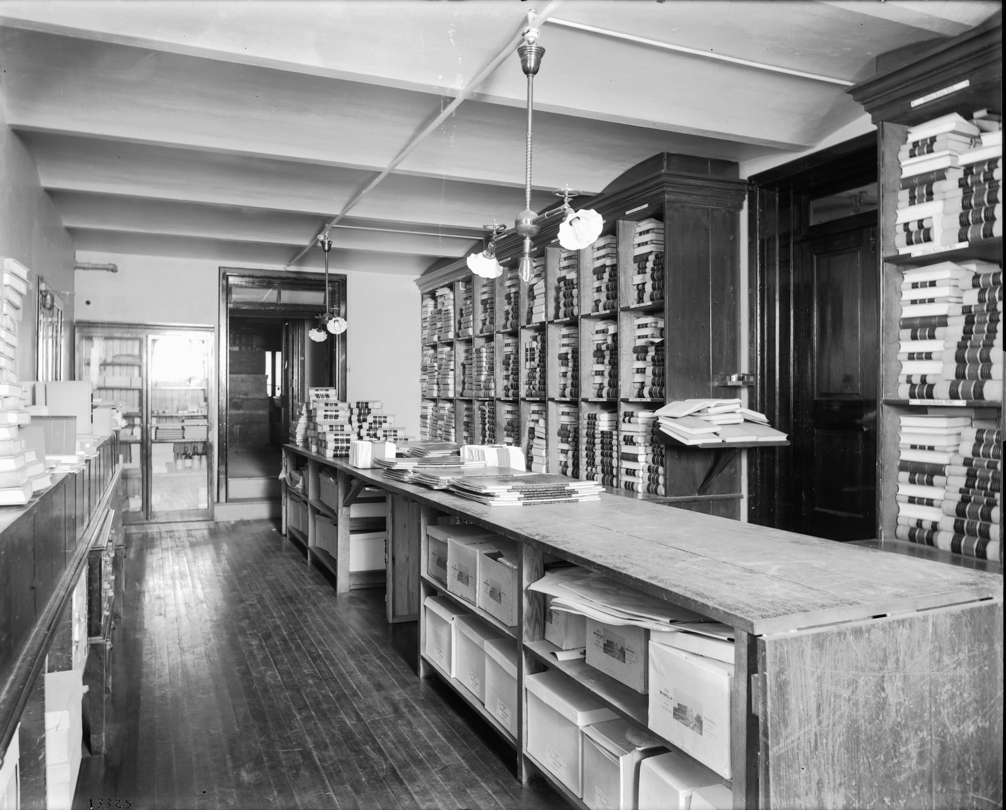 Receiving Room of the International Exchange Service in the Smithsonian Institution Building has a long counter with books stacked at one end, shelves holding books, a doorway and storage on the left.