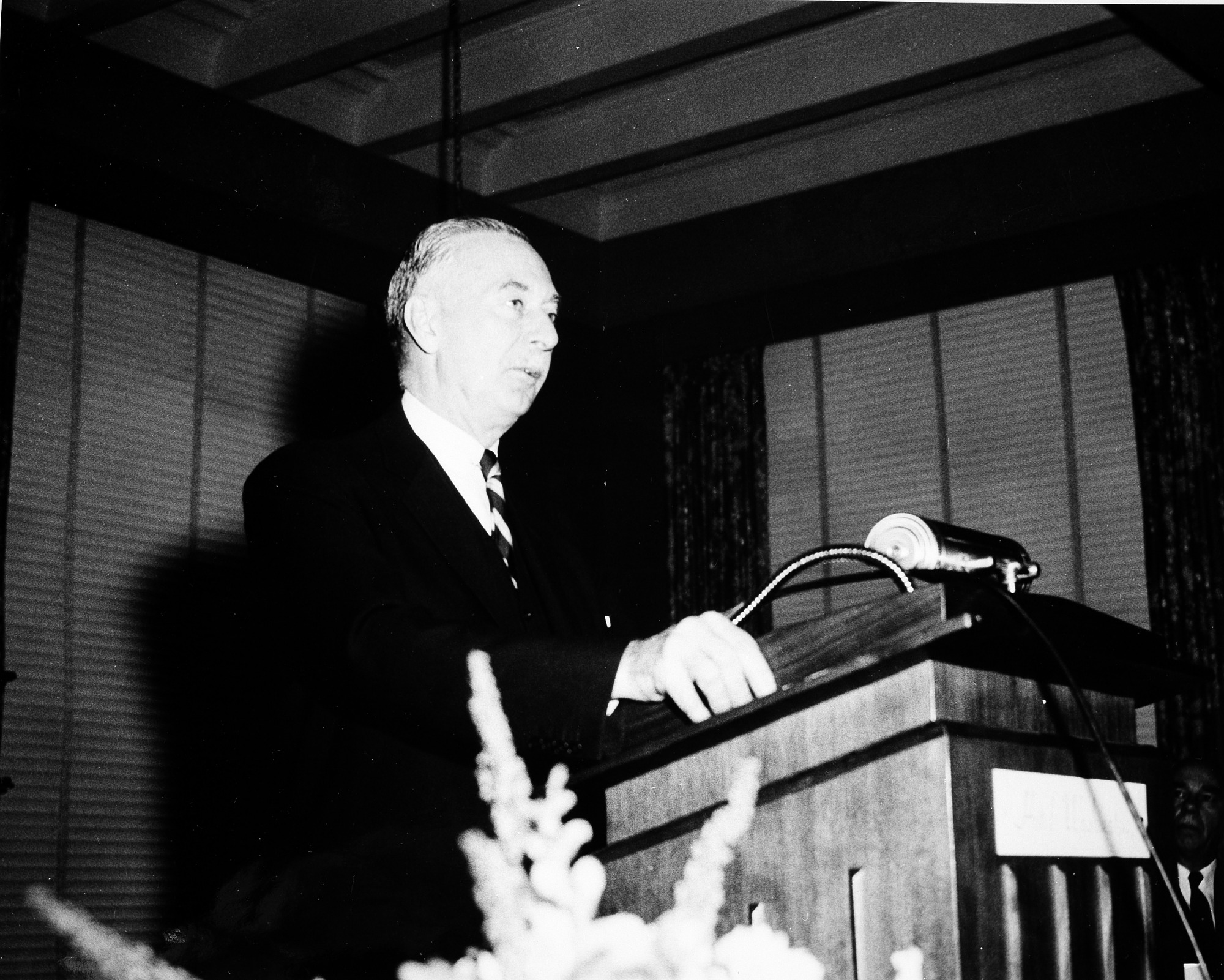 Leonard Carmichael, seventh Secretary of the Smithsonian Institution from 1953 to 1964, speaking from a podium.