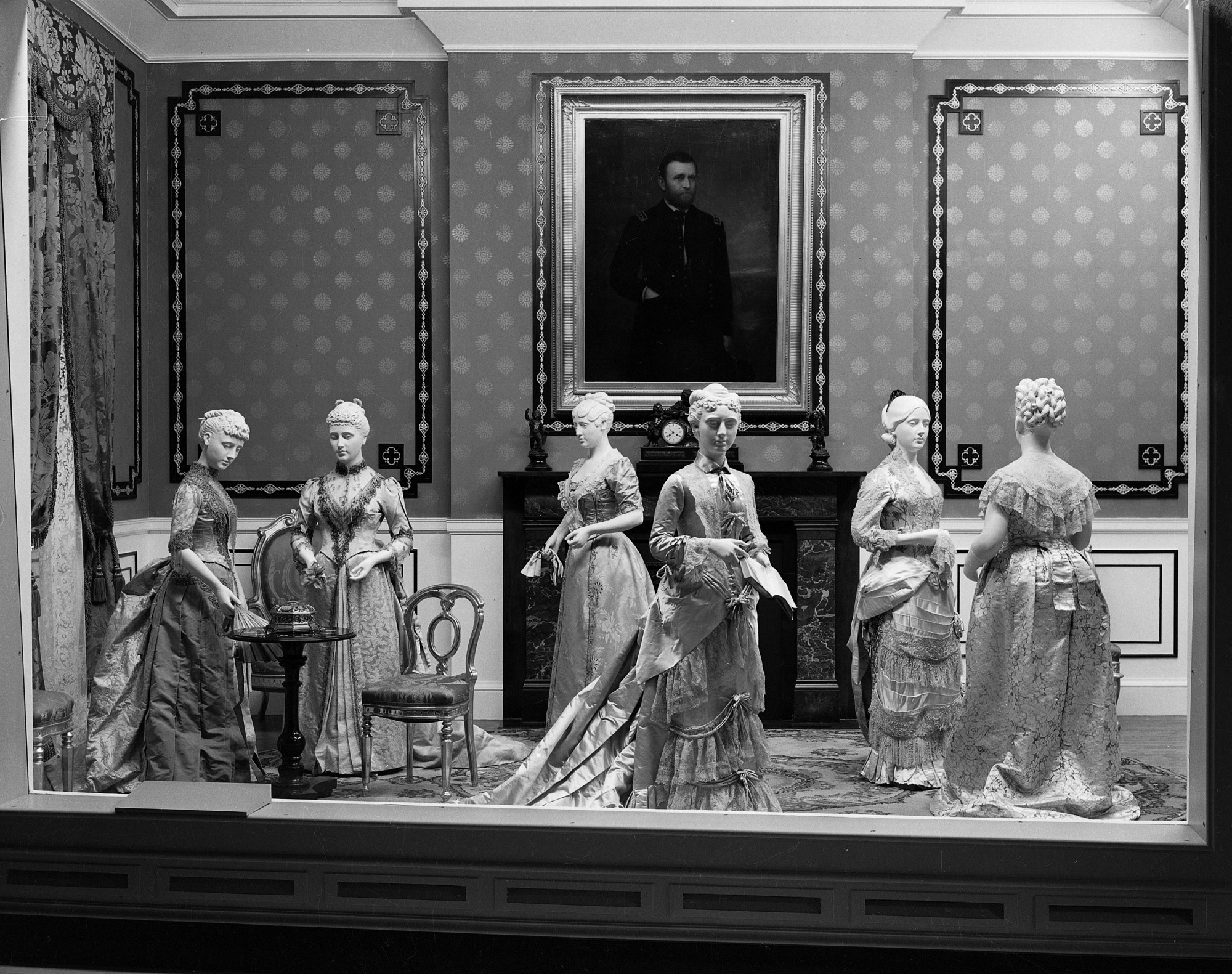 First Ladies Exhibit reinstalled in the West North Range of the Arts and Industries Building on May 24, 1955. The basis of this setting is the Blue Room of the White House as it looked at the time of the Grant Administration. The case contains the dresses of Julia Dent Grant; Lucy Webb Hayes, Lucretia Rudolph Garfield, Mary Arthur McElroy, sister of President Chester Arthur, and Caroline Scott Harrison and Mary Harrison McKee, who represented the administration of President Benjamin Harrison. A portrait of Grant hangs above the mantle.