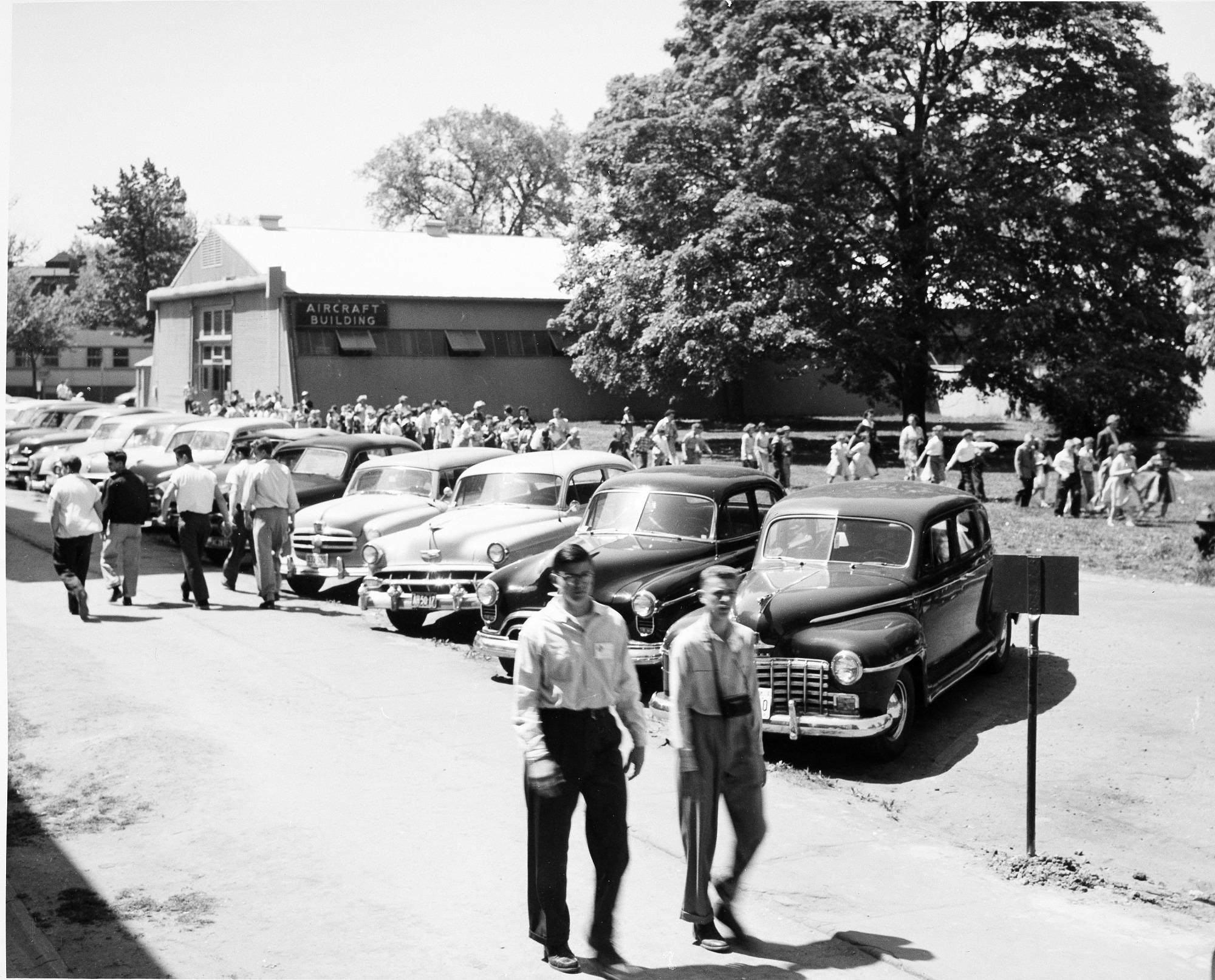 In the South Yard of the Smithsonian Institution visitors walk along a pathway and in the parking lot. Also, cars are parked in the South Yard, and the Air and Space Building (the temporary metal building) is in the background. Originally built in 1917 by the U.S. Signal Service for use during World War I, the temporary building was transferred to the Smithsonian in 1919 and was used as a museum. The building was demolished in 1975 in preparation for the Victorian Garden, the Bicentennial of the American Revolution celebrations, and the new National Air and Space Museum.
