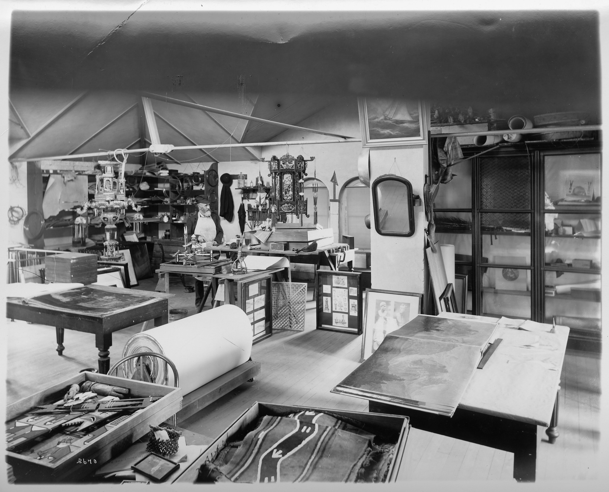 A work and storage area on the third floor of one of the pavilions in the United States National Museum, now the Arts and Industries Building. Looking to his left, a museum employee stands at a table with an object he is working on. Stored in the room are various artifacts including works of art, mirror, Native American objects, and Asian lanterns.