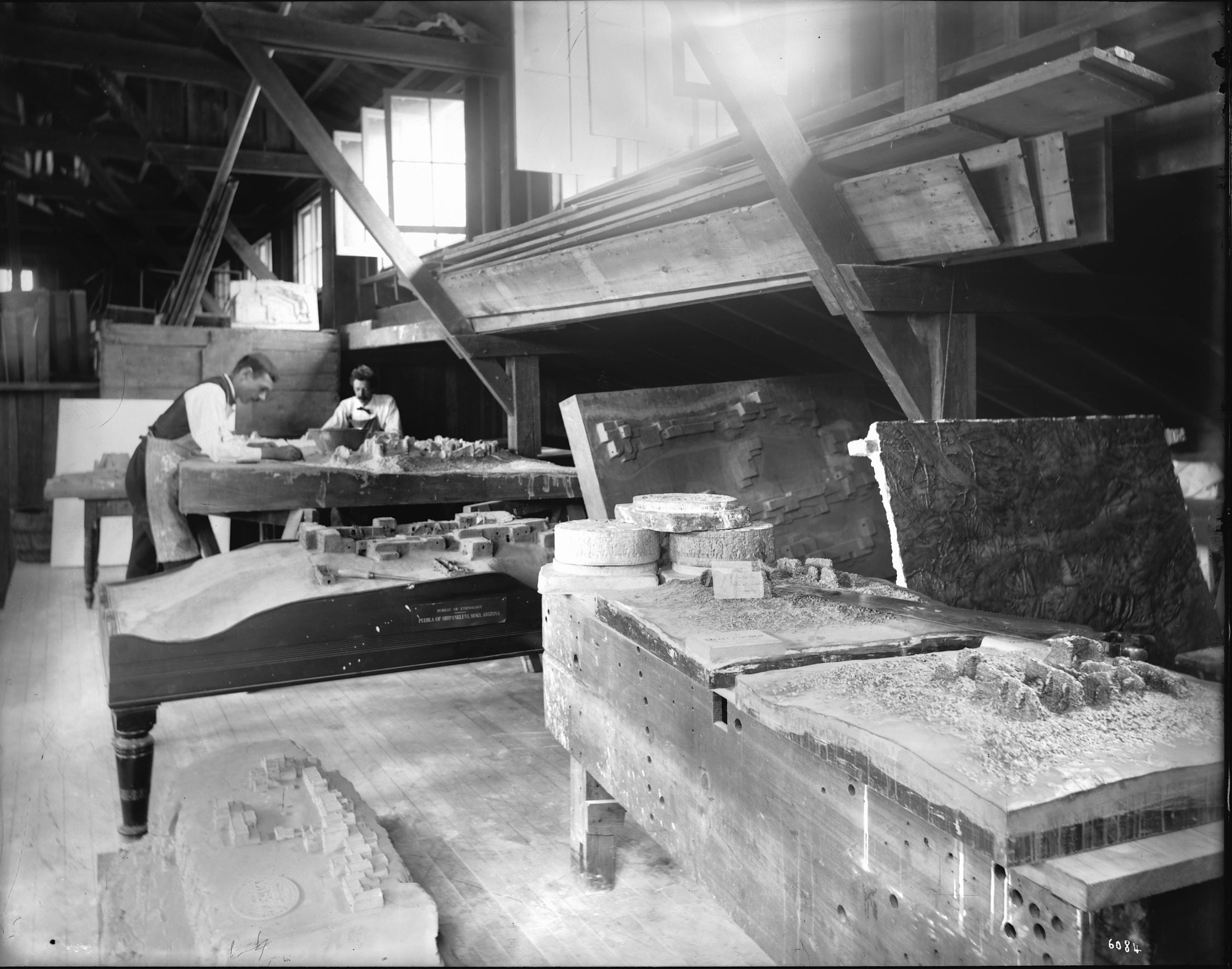 Victor and Cosmos Mindeleff building models of the Penasco Blanco Pueblo Indian village for use in the Bureau of American Ethnology exhibitions. This model was eventually moved from the Arts and Industries Building to the Natural History Building and was on exhibit there for more than 40 years. The Mindeleffs are working in the South Shed located in the South Yard behind the Smithsonian Building, also known as the "Castle."