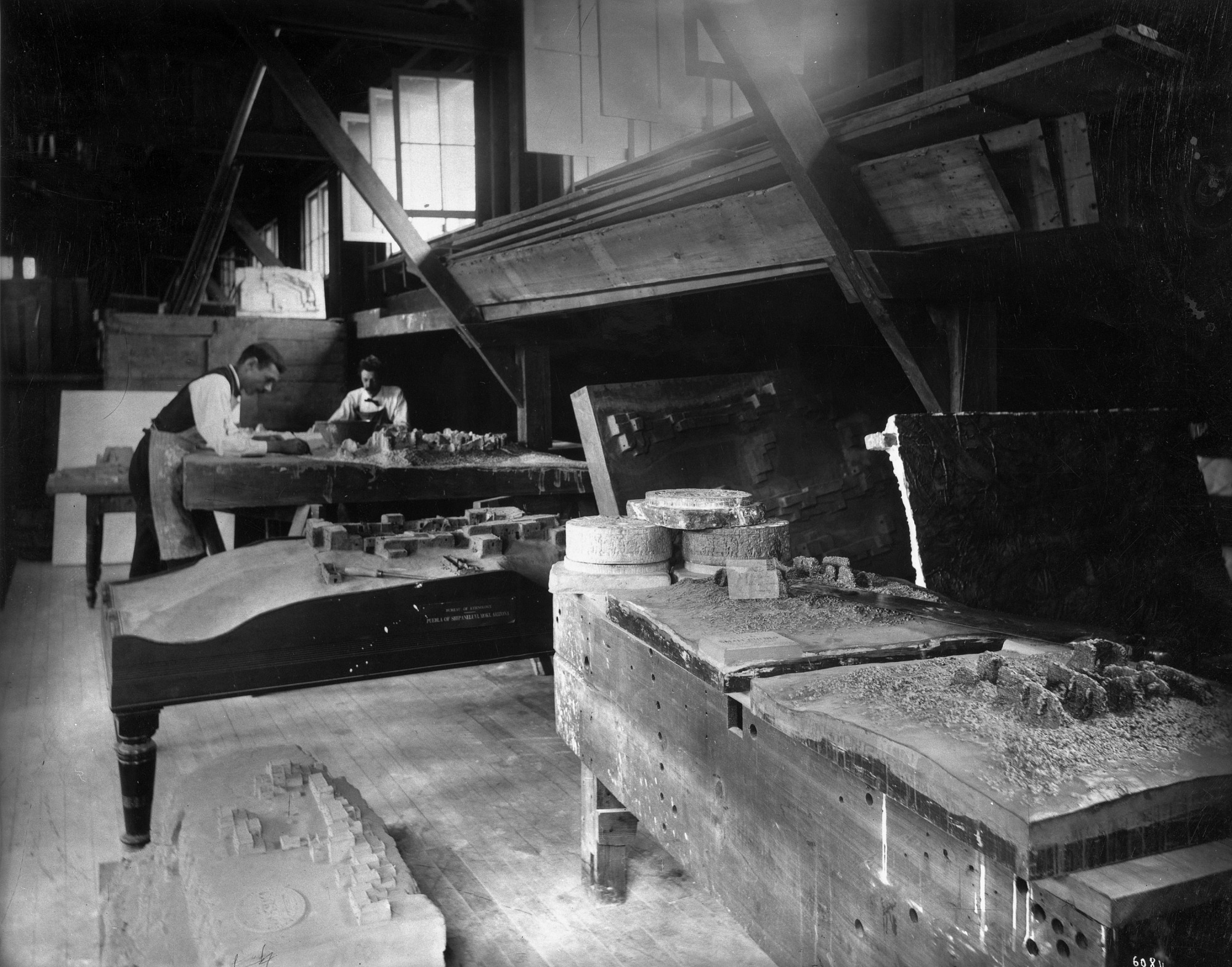 Two men can be seen working on one of the sections for the model of a pueblo Indian village, Penasco Blanco, for use in the United States National Museum exhibition. They are working in the South Shed located in the South Yard of the Smithsonian. The model was long exhibited in Hall 21 of the National Museum of Natural History but was destroyed in 1956. The label that accompanied this model says that "This model was prepared for the Bureau of American Ethnology by Victor and Cosmos Mindeleff, in 1885, on a scale of 1 inch to 5 feet of 1:60."