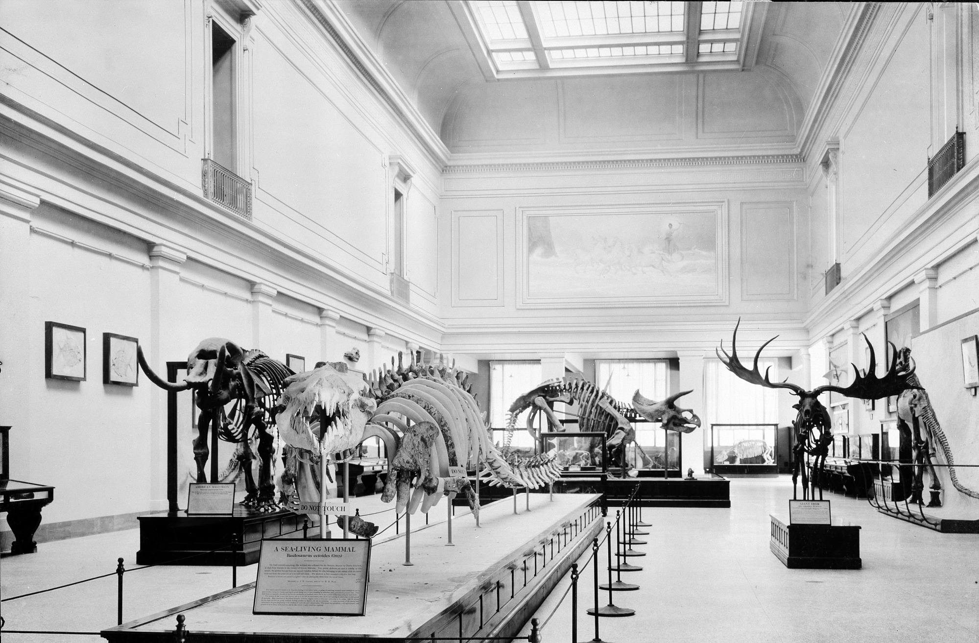 View of the Vertebrate Paleontology exhibit in the new United States National Museum, now the National Museum of Natural History. On exhibit are skeletons of various types of vertebrates including mammals, dinosaurs, and sea-living mammals. An Irish elk skeleton is on the right. The mural of "Diana of the Tides" can be seen on the rear wall.