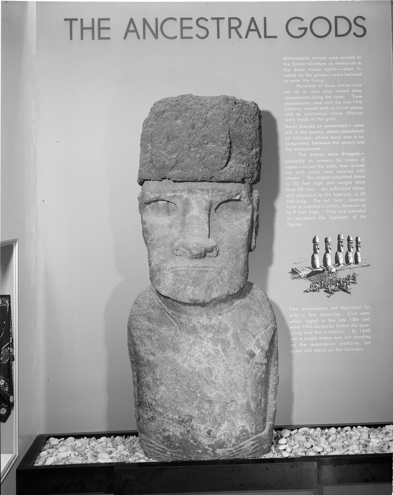 One of the gigantic, grotesque, "red-hatted" statues of human beings, which once surrounded much of the coast of mysterious Easter Island in the South Pacific, is the first object to confront visitors to the Smithsonian Institution's new hall of Pacific and South Asian Ethnology, recently opened in the National Museum of Natural History. (From a News Release by the Smithsonian Institution, August 2, 1962)