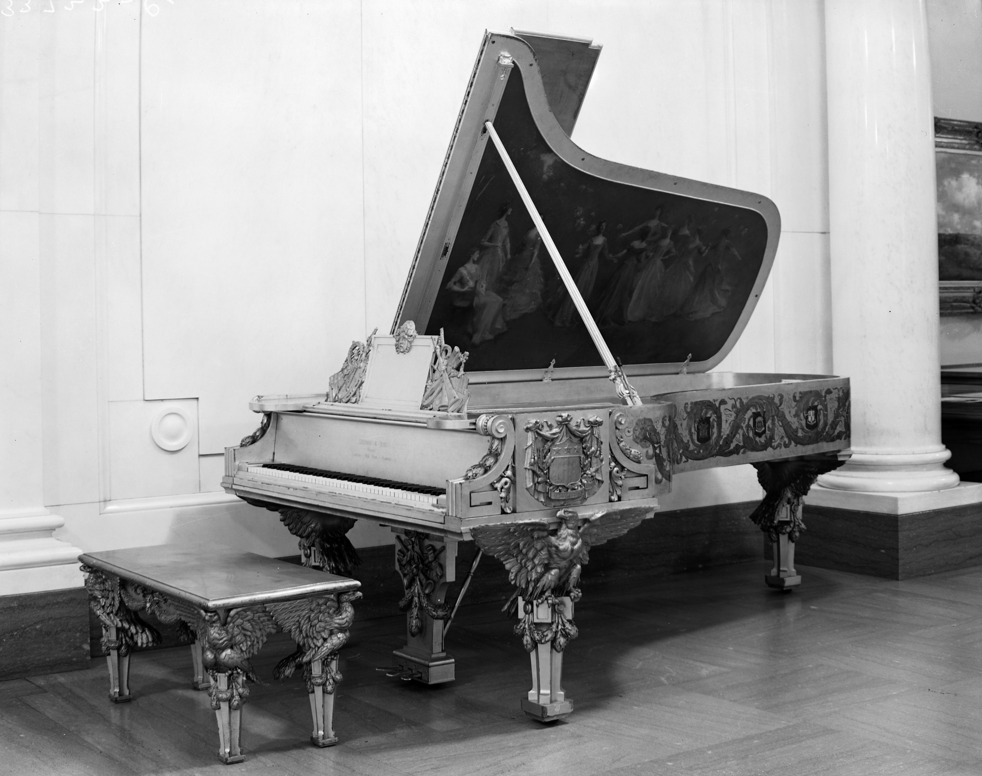 A Steinway concert grand piano was transferred to the United States National Museum (USNM) from the White House on December 8, 1938, is featured in the National Collection of Fine Arts' (NCFA), now the Smithsonian American Art Museum (SAAM), Centennial exhibit in the NCFA gallery in the Natural History Building (NHB). The exhibit was on display from May 17 through July 1951. The lid of the piano, which belonged to President Theodore Roosevelt and was called the "gold" piano, and is open to show a painting by Thomas Wilmer Dewing (1851-1938) which was painted on the underside of the lid.
