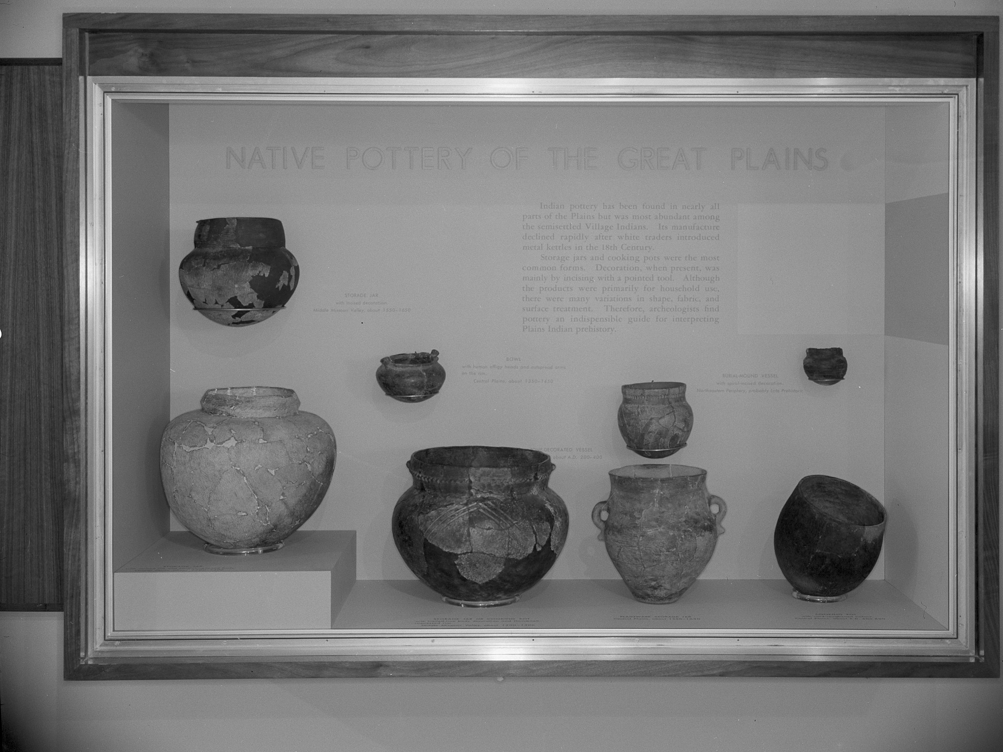 An exhibit of pottery used by the Native Americans of the Great Plains is on display in the National Museum of Natural History's North American Archeology Exhibit which opened in November 1962.