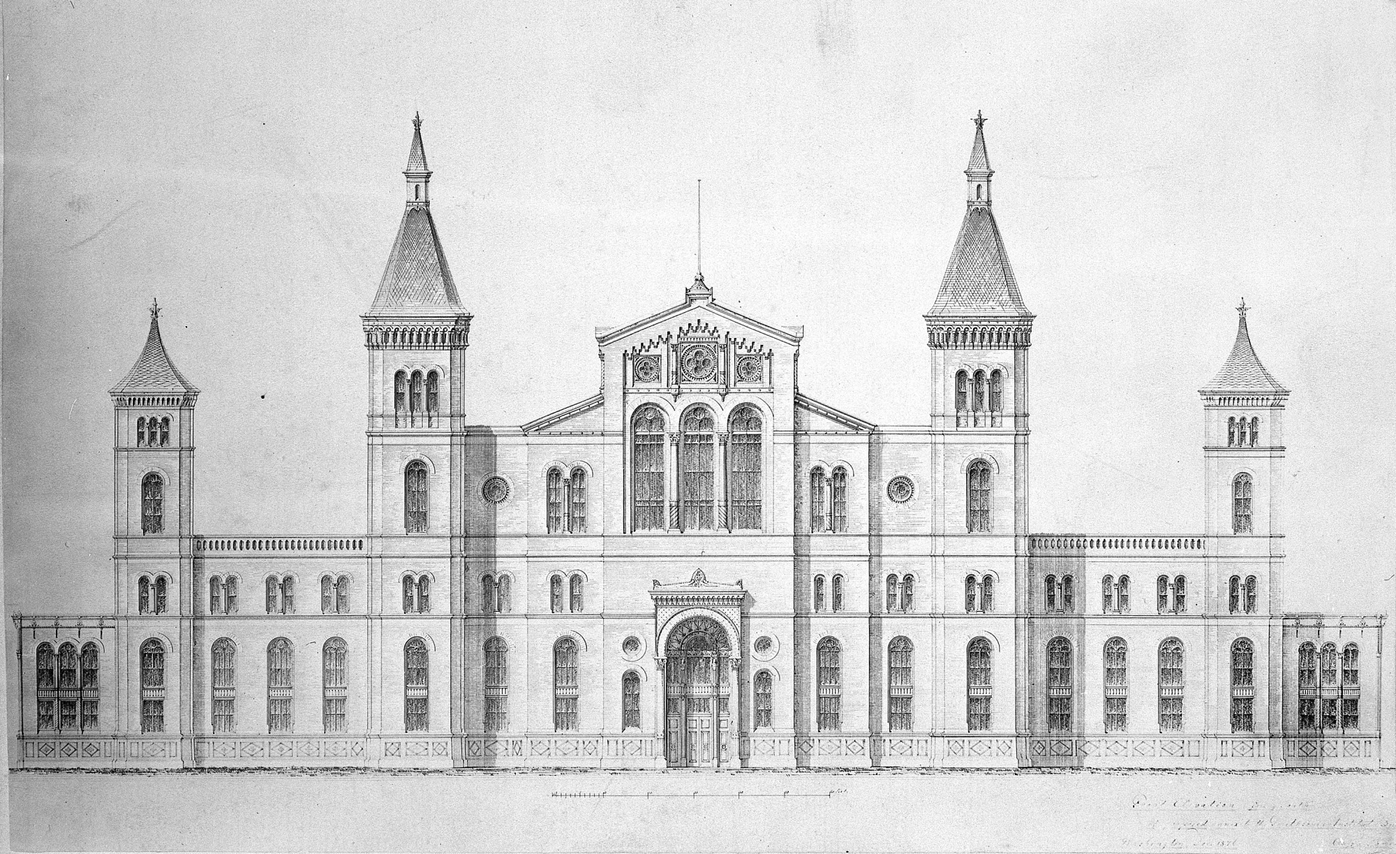 Preliminary drawing by Adolf Cluss and Frederick Daniel, architects, of the exterior for the proposed United States National Museum, now the Arts and Industries Building. Cluss and Daniel were business partners from 1876 to 1878. They submitted plans for the SI Bldg Annex in 1976 as well as early plans for the A&I Building.