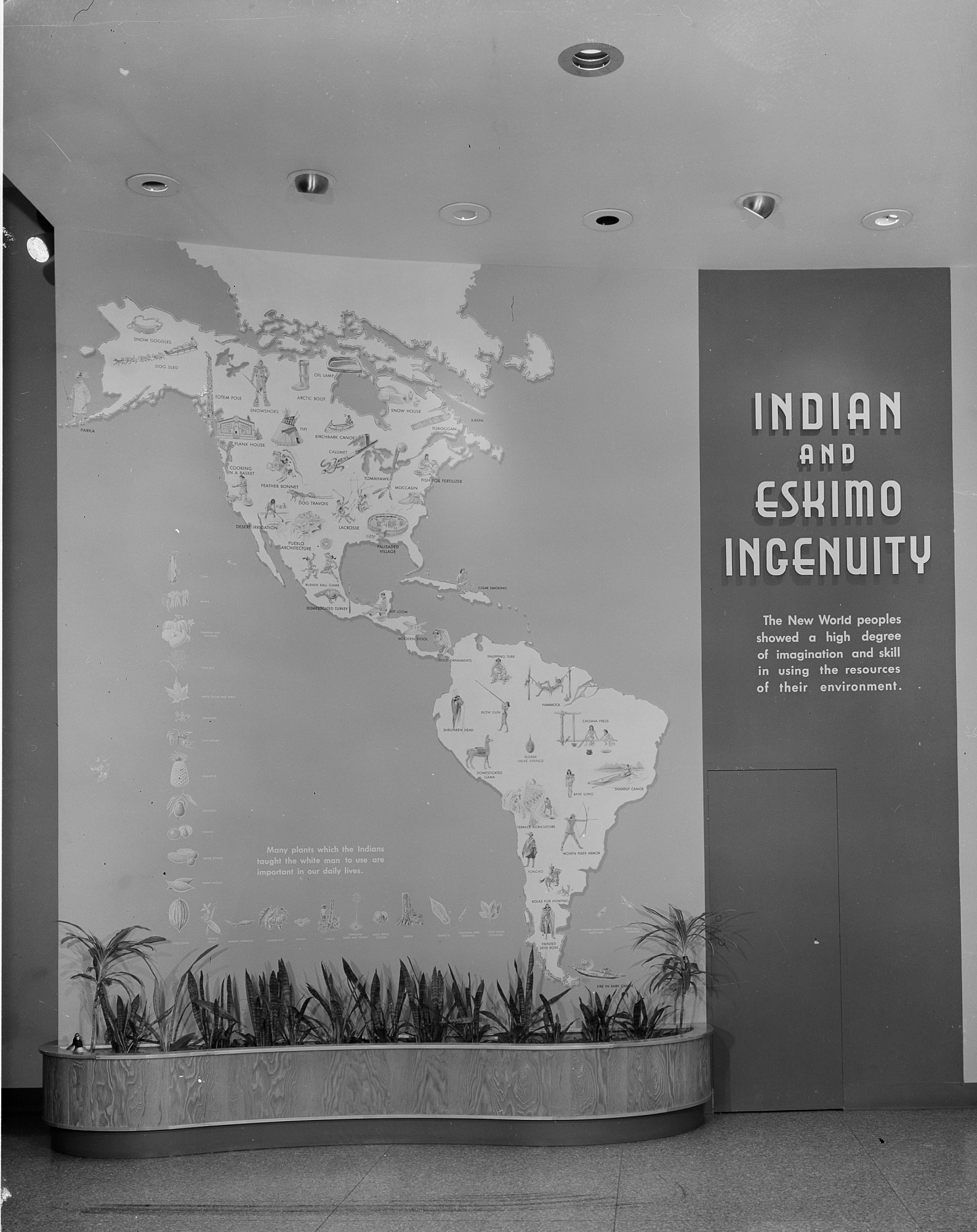 Map, that goes from floor to ceiling of North and South America, showing examples of Native Americans imagination and skill in using the resources of their environment is part of the exhibit entitled "Native Peoples of the Americas" which opened in 1957 in the National Museum of Natural History.