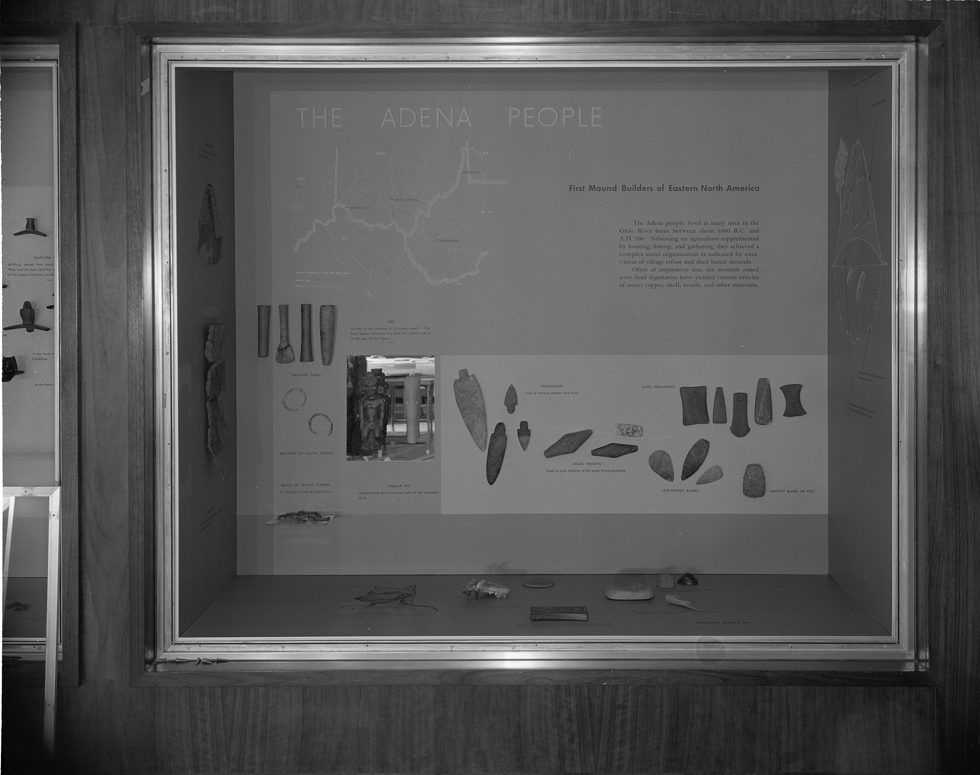 Exhibit of articles found in mounds built by the Adena people of the Ohio River Basin in the National Museum of Natural History's North American Archeology Exhibit which opened in November 1962.