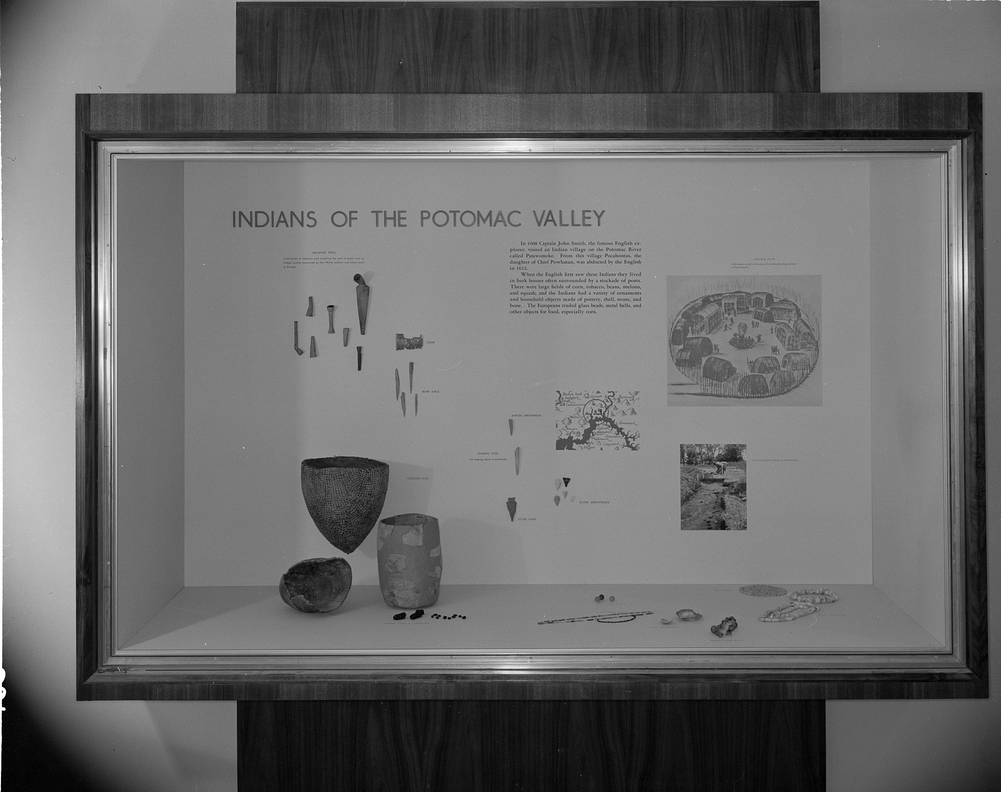 An exhibit of Indians of the Potomac Valley. The exhibit, which is on display in the National Museum of Natural History's North American Archeology Exhibit which opened in November 1962, contains ornaments and household objects made of pottery, shell, stone, and bone by the Indians of the Potomac Valley (Patawomeke), drawing of a typical village layout, location map, and a photograph of an archeological dig.
