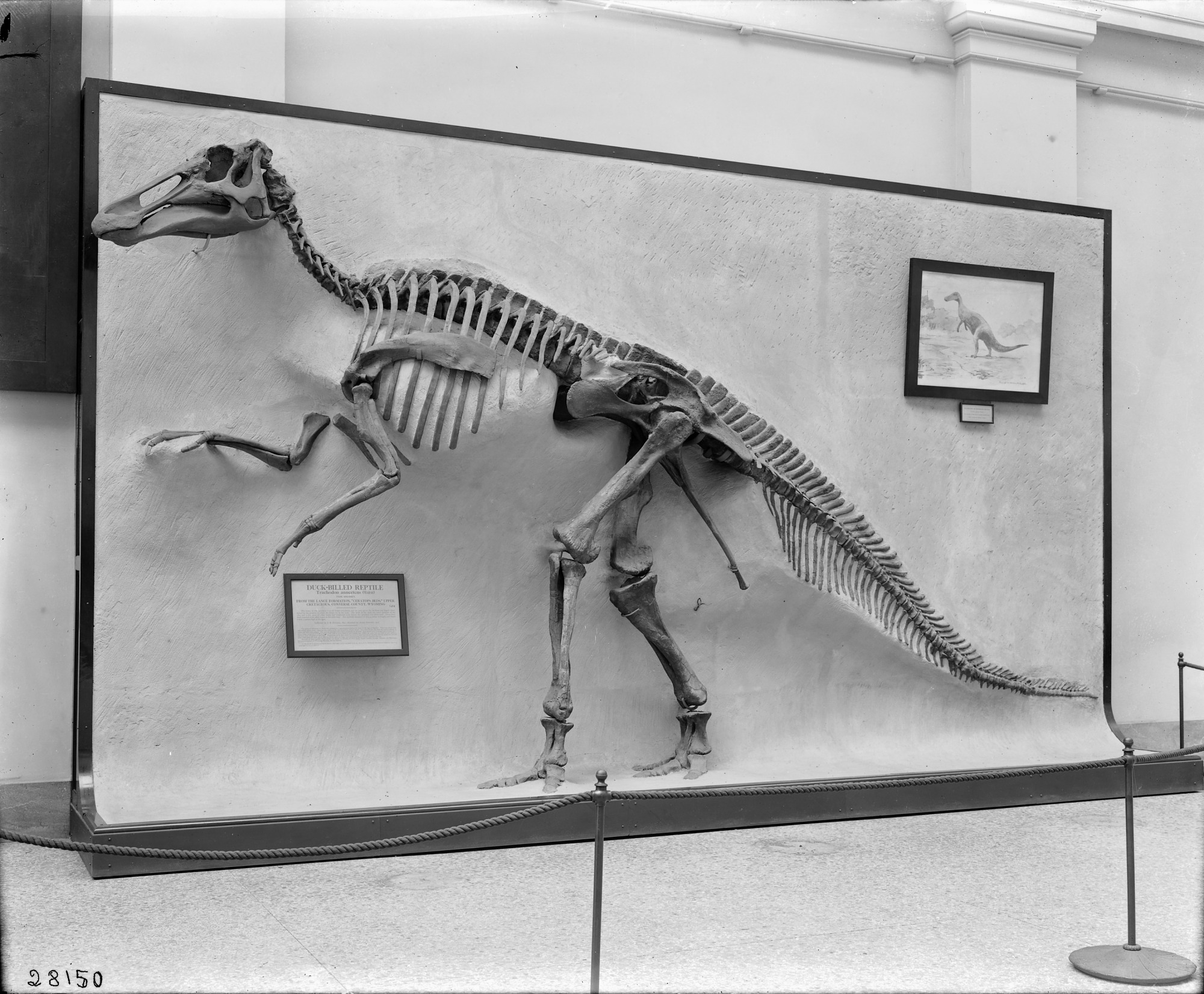 A duck-billed reptile, Edmontosaurus annectens, catalog number USNM V 2414, in the Paleontology Exhibit in the United States National Museum, now known as the National Museum of Natural History, c. 1911-1930. The reptile was found in the Lance Formation "Ceratops beds," Upper Cretaceous, Converse County, Wyoming, in 1891.
