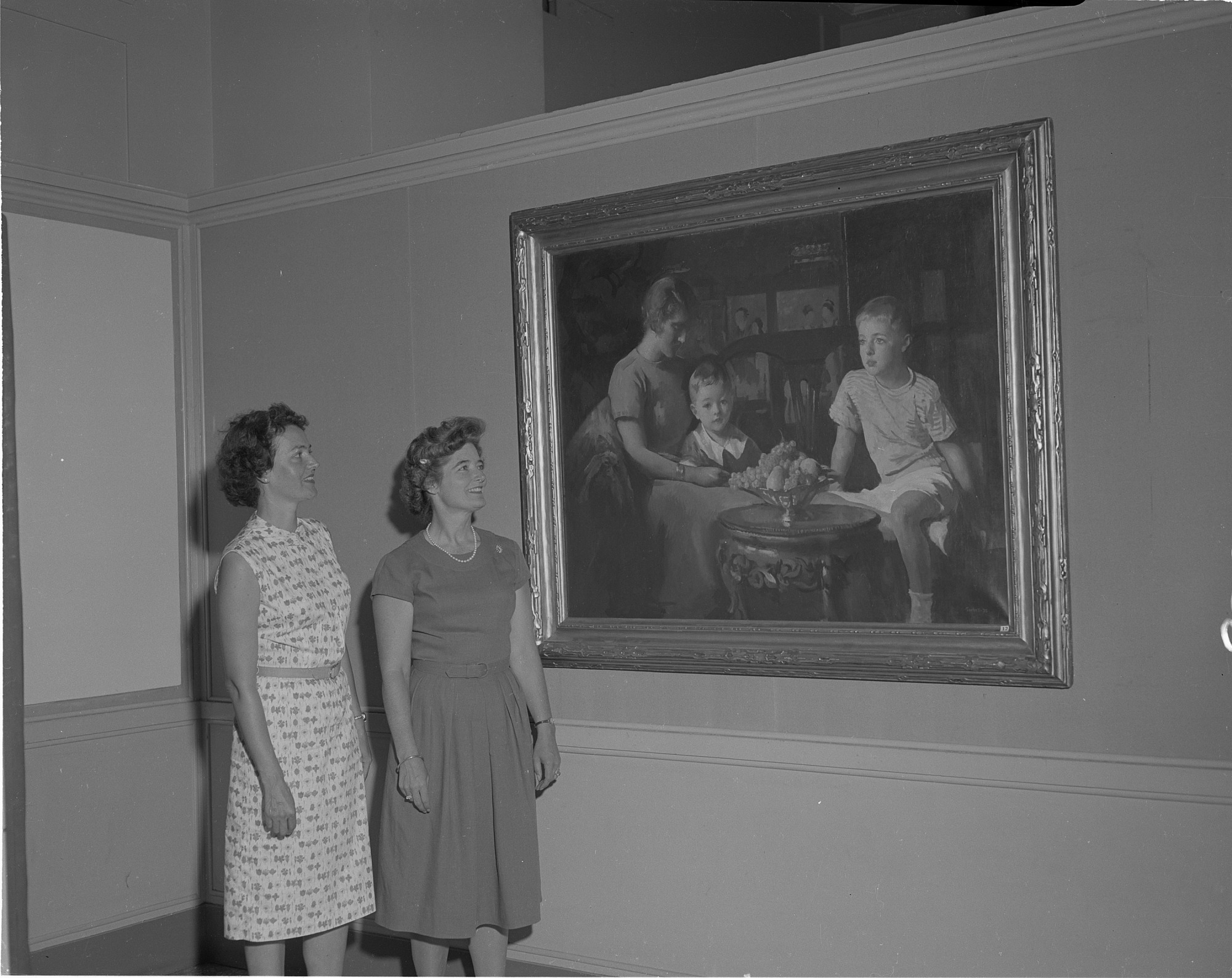 A painting from the exhibition "Centennial Exhibition of Painting by Edmund C. Tarbell" hangs in the Foyer Gallery of the Natural History Building. The exhibition, from July 9 to August 19, 1962, is by the National Collection of Fine Arts, now the Smithsonian American Art Museum. Mrs. Albert Cannon and Mrs. John Hoes are standing looking at the painting by the American artist Edmund C. Tarbell.