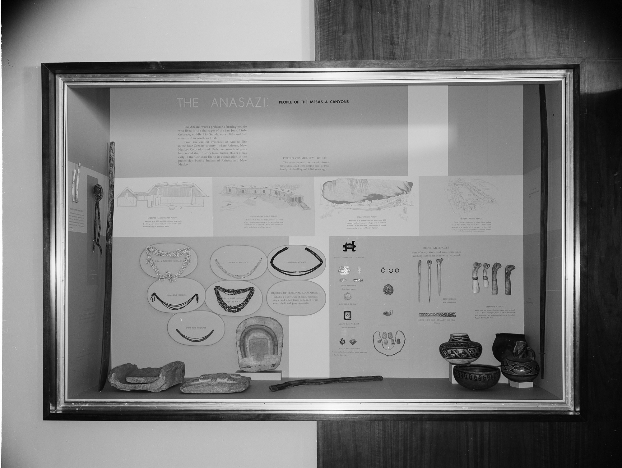 An exhibit case on the Anasazi, the people of the mesas and canyons, contains drawings of Pueblo Community Homes, objects of personal adornment and bone artifacts. The exhibit is on display in the North American Archeology Exhibit, which opened in November 1962, in the National Museum of Natural History.