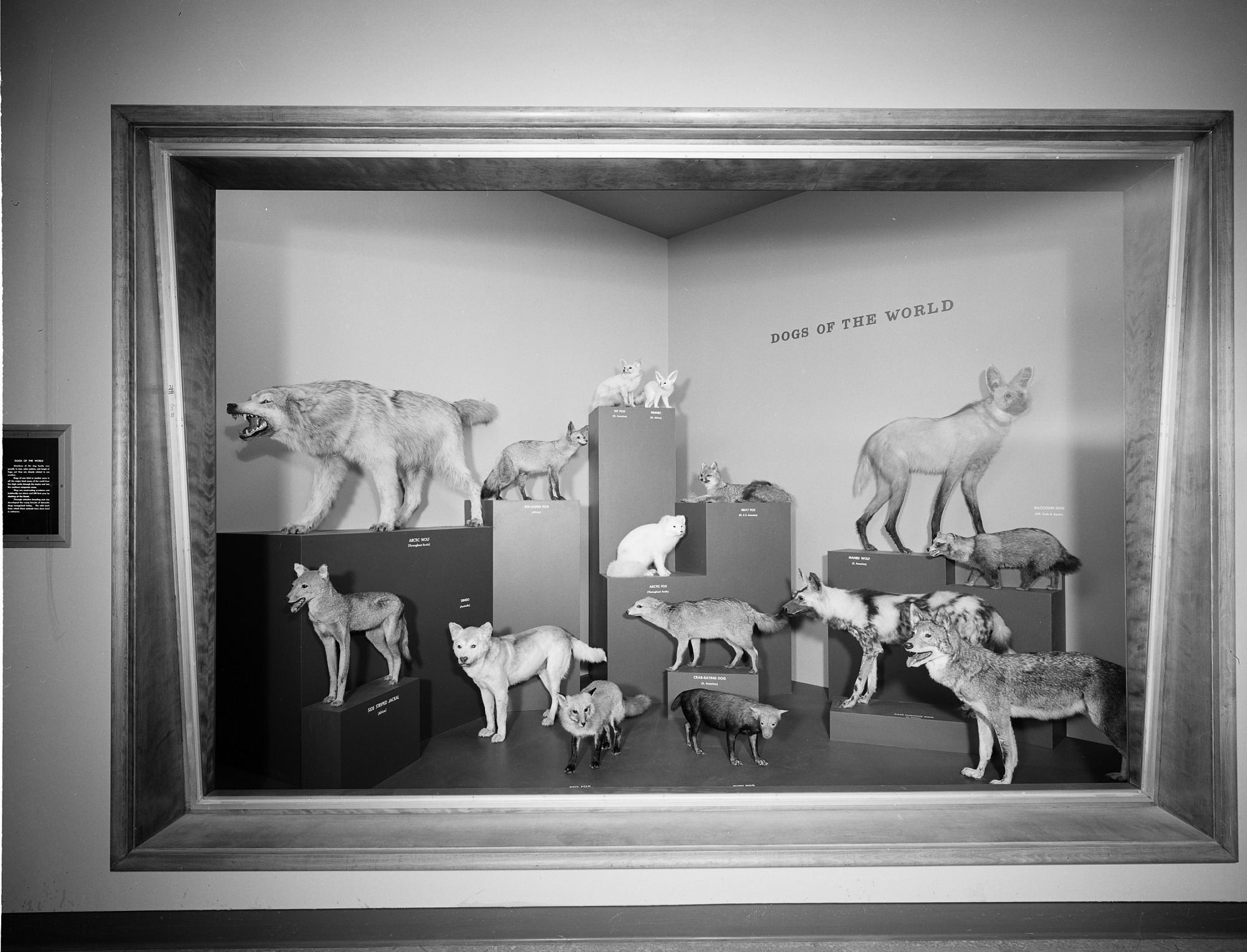 Exhibit case entitled "Dogs of the World" contains dogs from around the world. The exhibit is in the Hall of Mammals, National Museum of Natural History.
