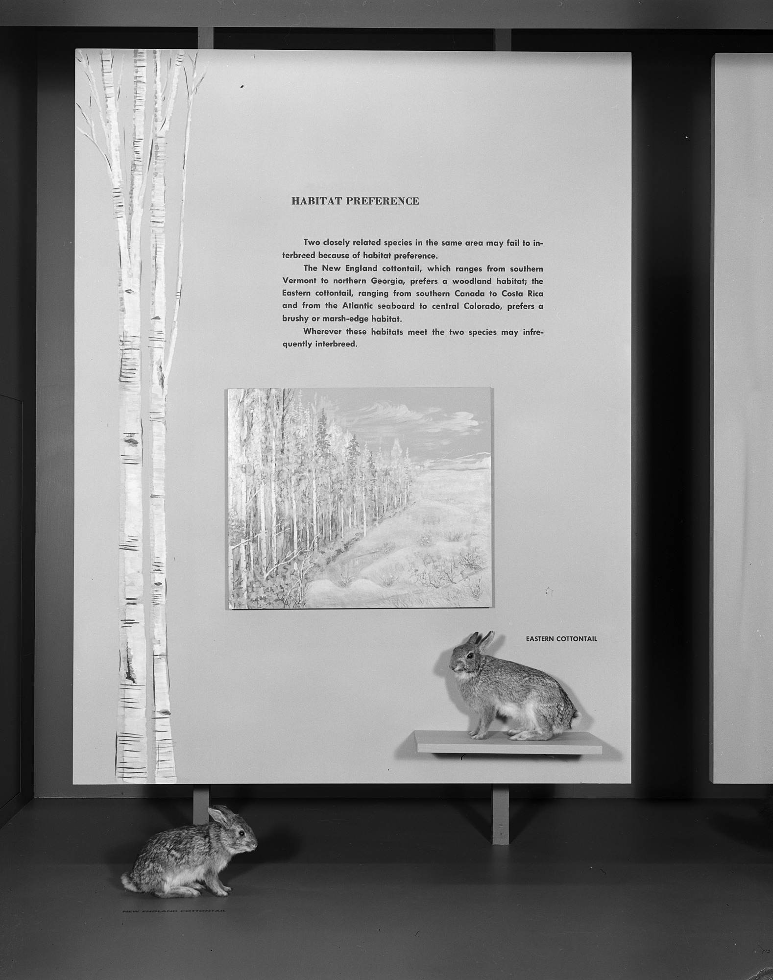 Exhibit case shows the habitat preference of two closely related species, the New England cottontail and the Eastern cottontail. The exhibit is in the Hall of Mammals, National Museum of Natural History.