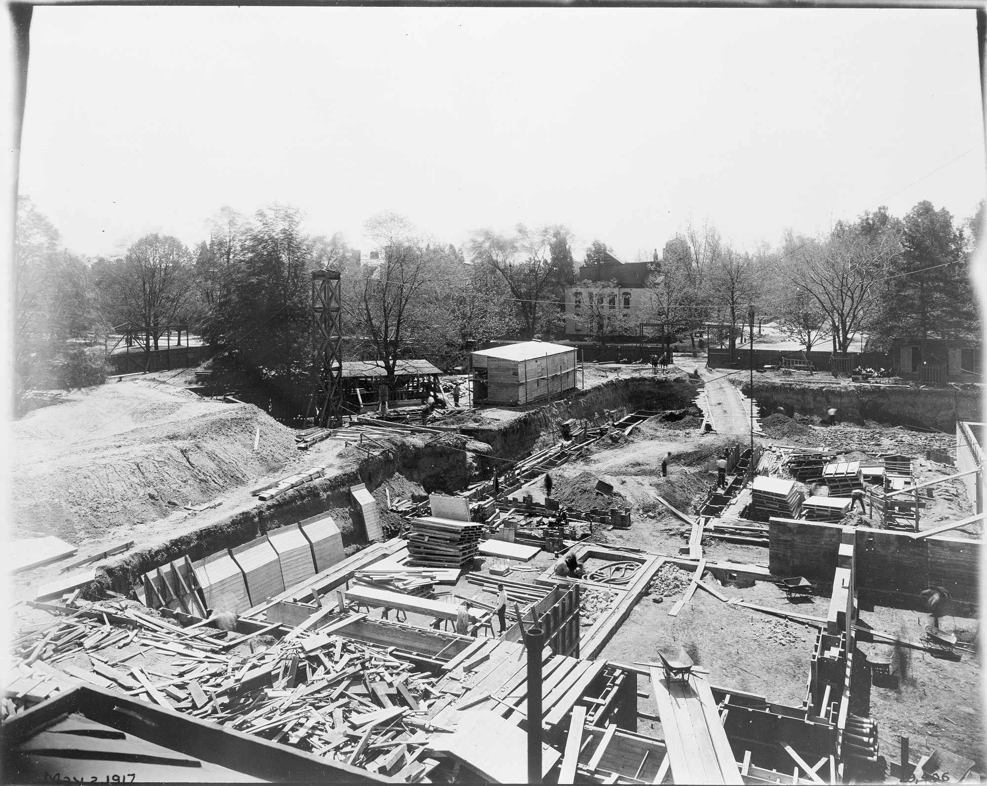 The foundation has been laid for the Freer Gallery of Art and the next phase of construction has begun. Workers can be seen busy at various tasks. A house on B Street, now Independence Avenue, is visible in the background.