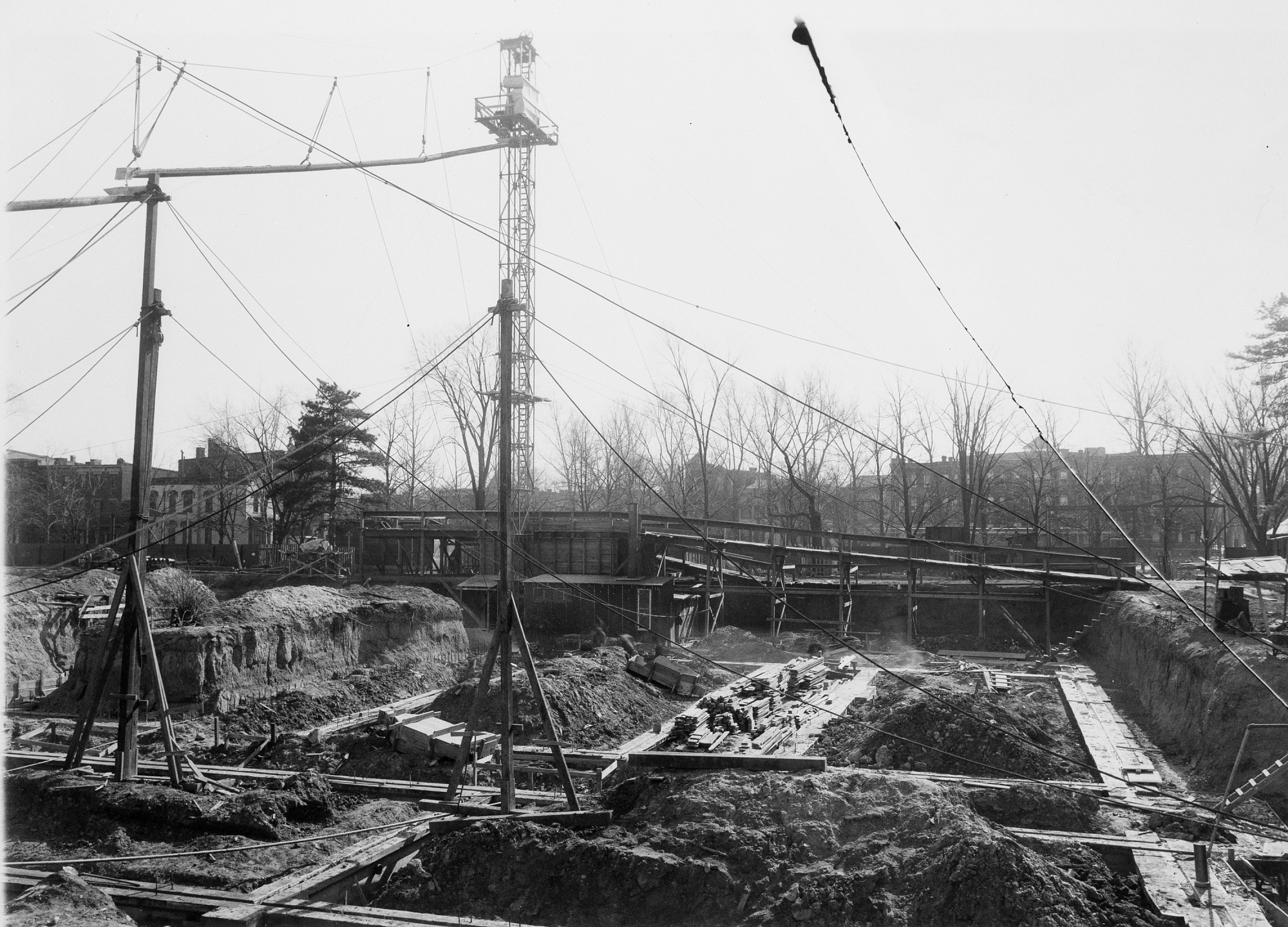 Laying of the foundation for the new Freer Gallery of Art, which was designed by Architect Charles A. Platt. Visible in the background are buildings on B Street, now Independence Avenue.
