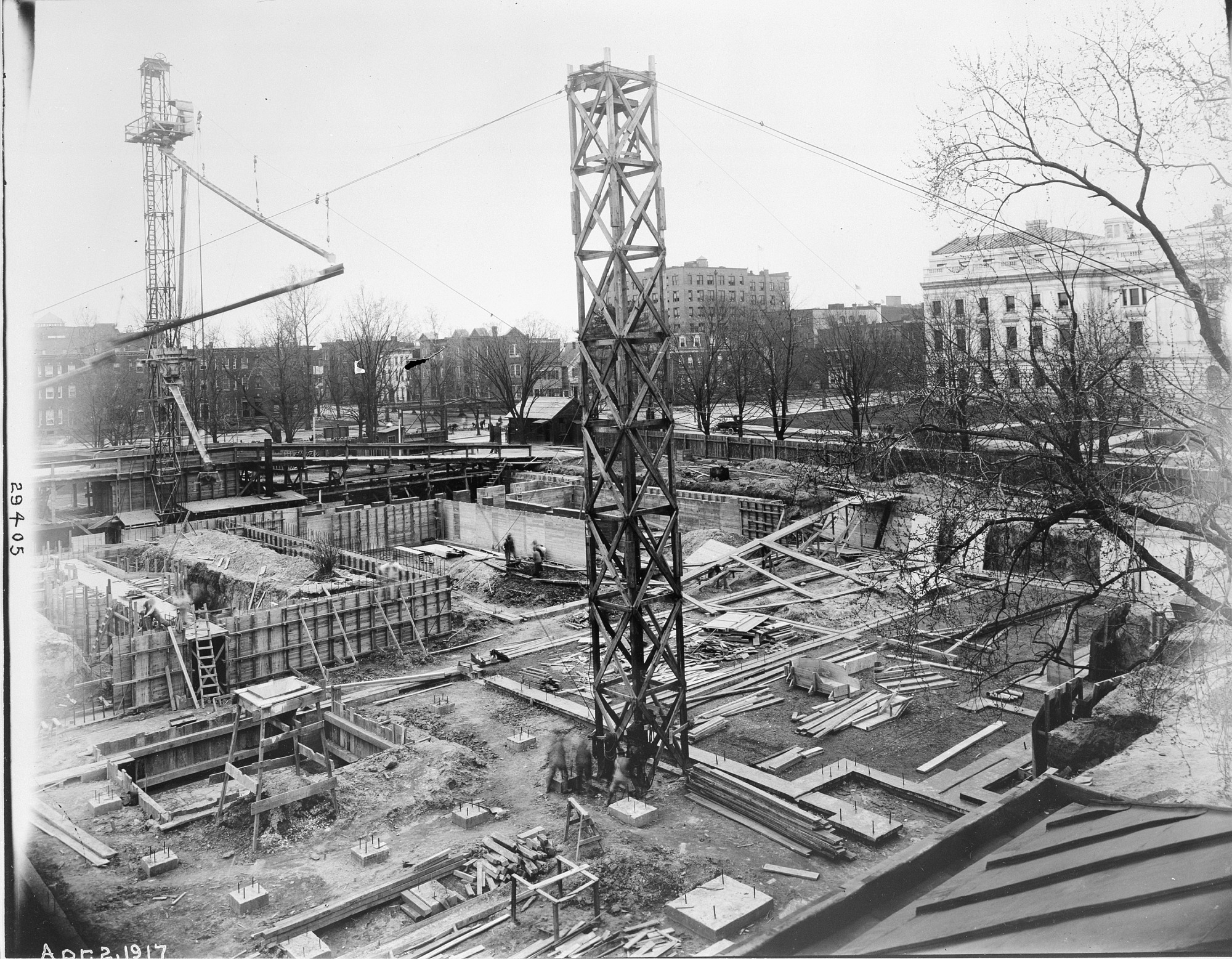 Construction of the Freer Gallery of Art continues. Two construction towers have been erected, one to the left and one in the middle. Houses and buildings are visible in the background including the Department of Agricultural Building on the right.