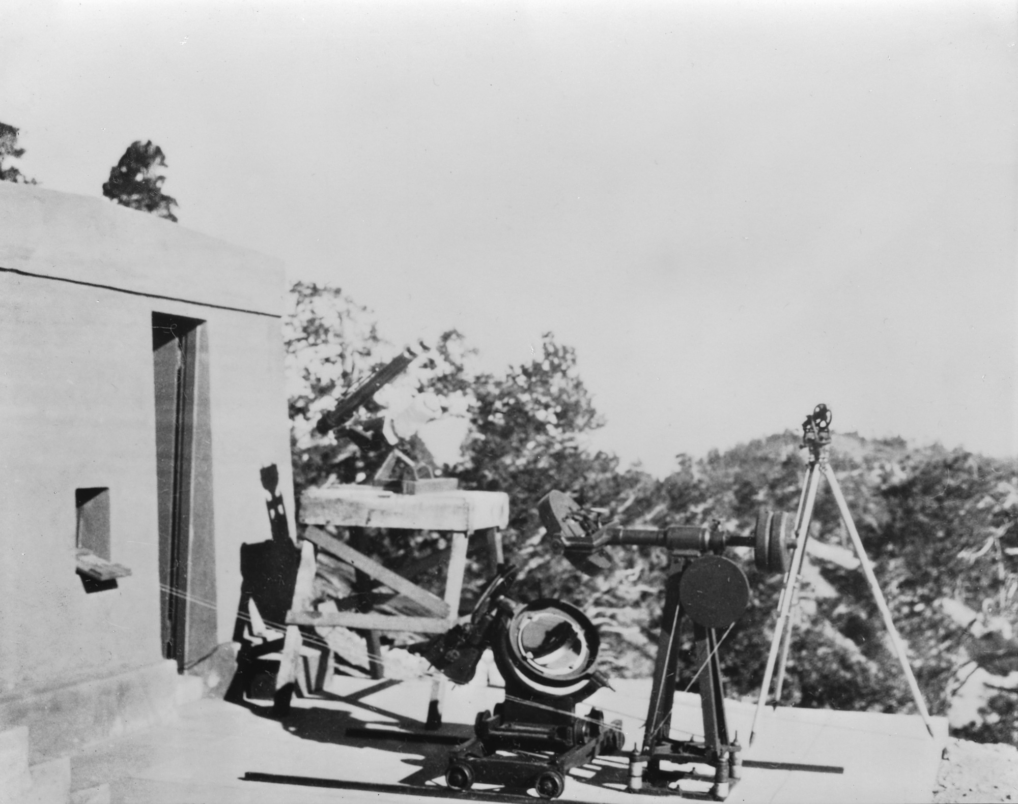 Solar observation Instruments outside the entrance to the instrument tunnel at the solar observing station of the Smithsonian Astrophysical Observatory at Table Mountain, California.