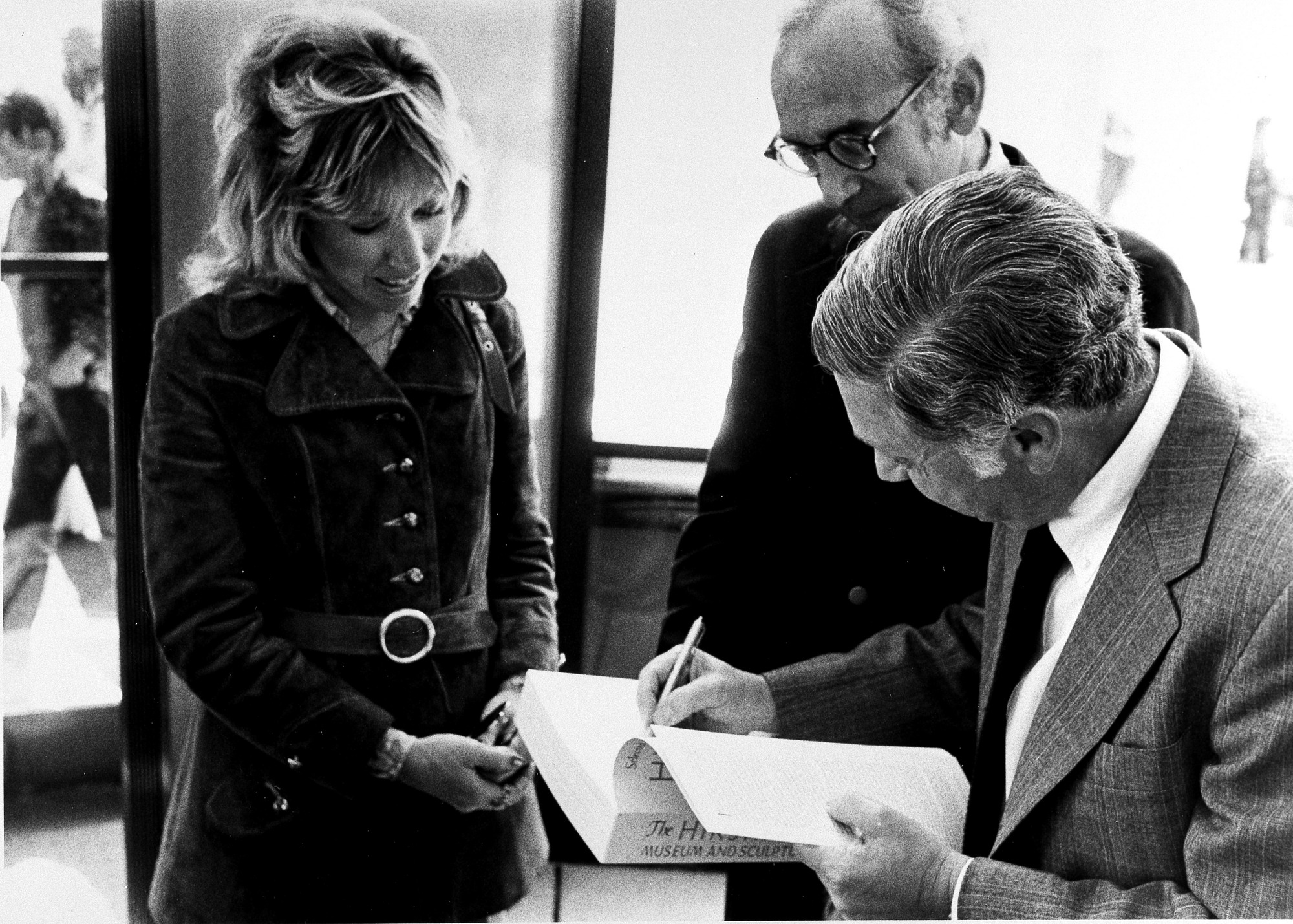 Abram Lerner, Director, Hirshhorn Museum and Sculpture Garde, 1967-1984, autographs a copy of the Hirshhorn inaugural book for Mrs. Kaylene Bauer of Las Vegas, the millionth visitor to the Hirshhorn Museum and Sculpture Garden. Charles Blitzer, Assistant Secretary for History and Art, 1968-1983, looks on.