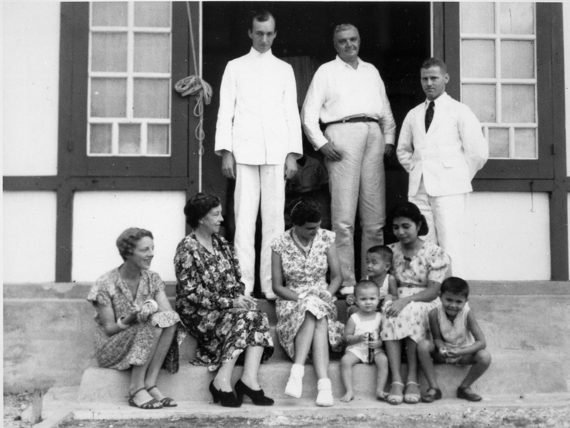 S. Dillon Ripley (1913-2001) in Sorong, New Guinea on the Denison-Crockett South Pacific Expedition in 1938, probably May. Ornithologist Ripley joined the expedition to collect birds. The group is pictured in front of a house. Seated, left to right: Charis Denison Crockett; Constance Baillie Rose Ripley (S. Dillon's mother who was visiting); "Didie" Smith Lowndes (Mrs. Lloyd Lowndes); Lodora van der Goot (Mrs. S. van der Goot), and her three sons. Standing at rear, left to right: S. Dillon Ripley; Harry Kern; and Shirk van der Goot.