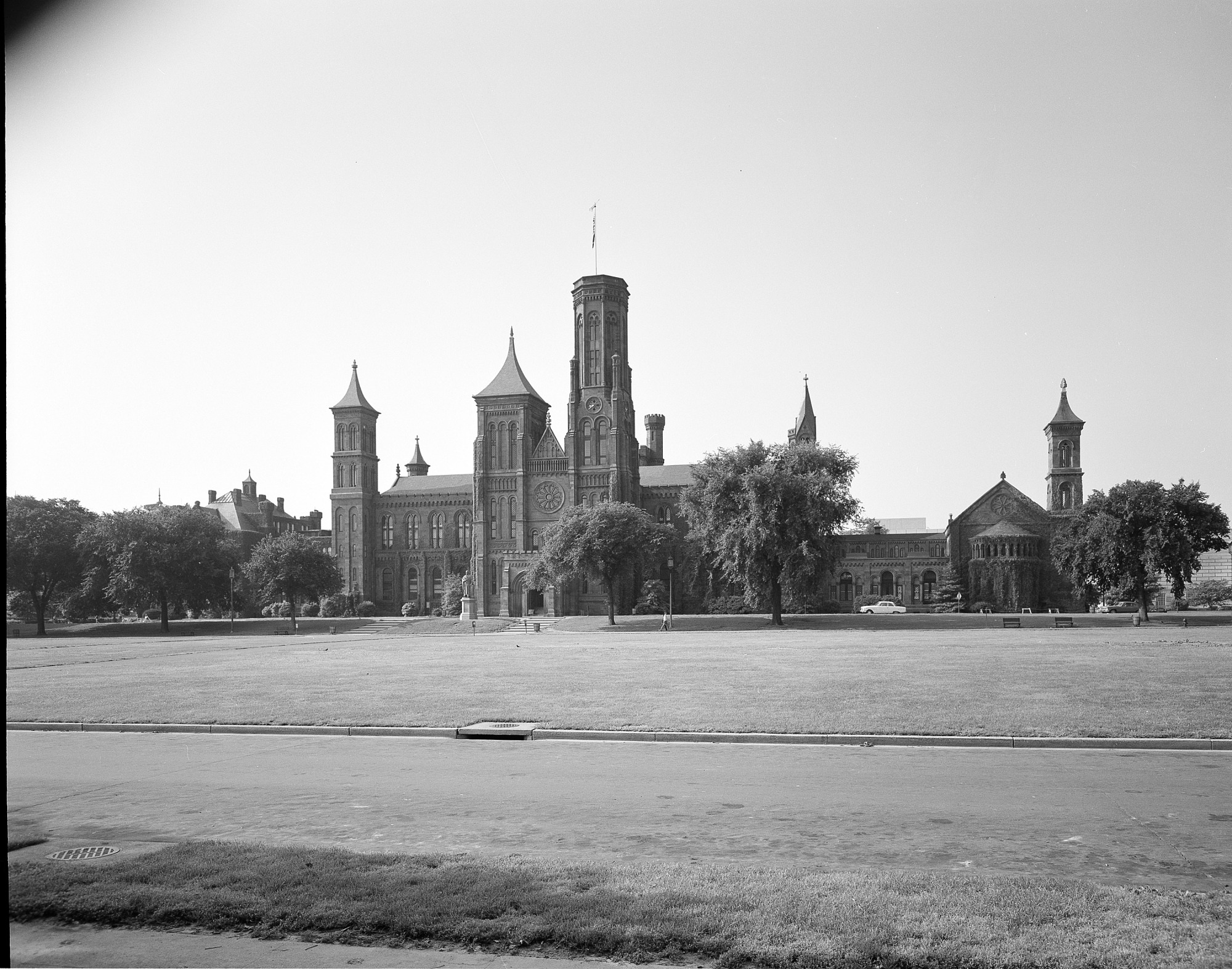 The Smithsonian Institution Building or "Castle" seen from across The Mall. The Joseph Henry Statue in front of the building was turned in 1965 to face the Mall. The Arts and Industries building can be partially seen on the left.
