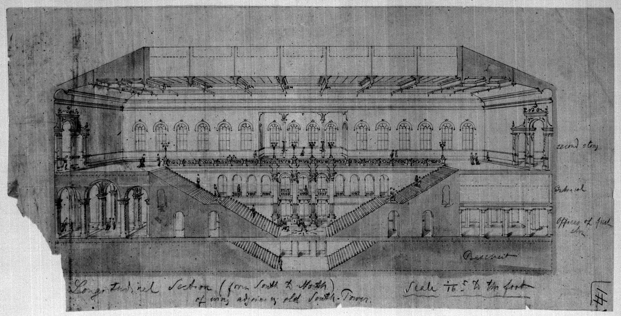 Rendering by General Montgomery Meigs of a longitudinal section (south to north) of a proposed addition to Smithsonian Institution Building adjoining the old south tower. This addition would contain the new National Museum Building that would be attached to the Smithsonian Institution Building on the south side. This addition was never built; a separate building, now known as the Arts and Industries Building, was built to the east of the Castle and opened in 1881.
