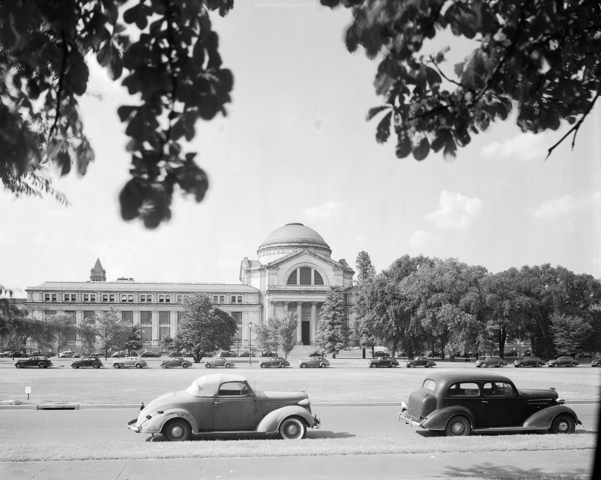 View from across the Mall of the United States National Museum (USNM) building, before the wing additions. It is now the Natural History Building (NHB) housing the National Museum of Natural History (NMNH). Cars are parked along the streets of the Mall.