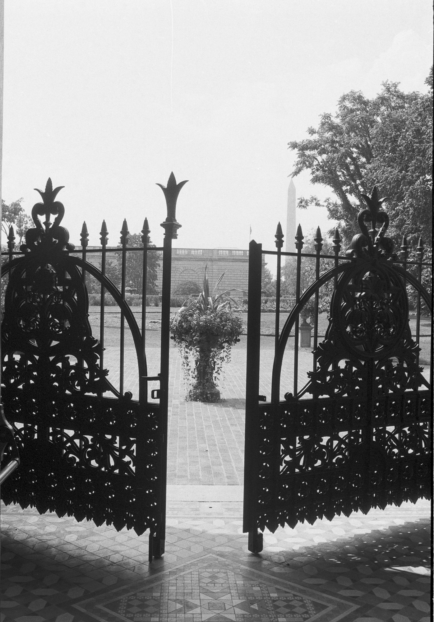 This set of elaborate iron gates, one of four pairs created in 1879 to adorn the entrances to the United States National Museum, were reinstalled outside the west door to the Arts and Industries Building in September 1979 after extensive restoration, following their discovery in Tennessee and return to Washington, D.C. This photo looks out through the gates onto the Victorian Garden with the Freer Gallery of Art in the distance and the Washington Monument.