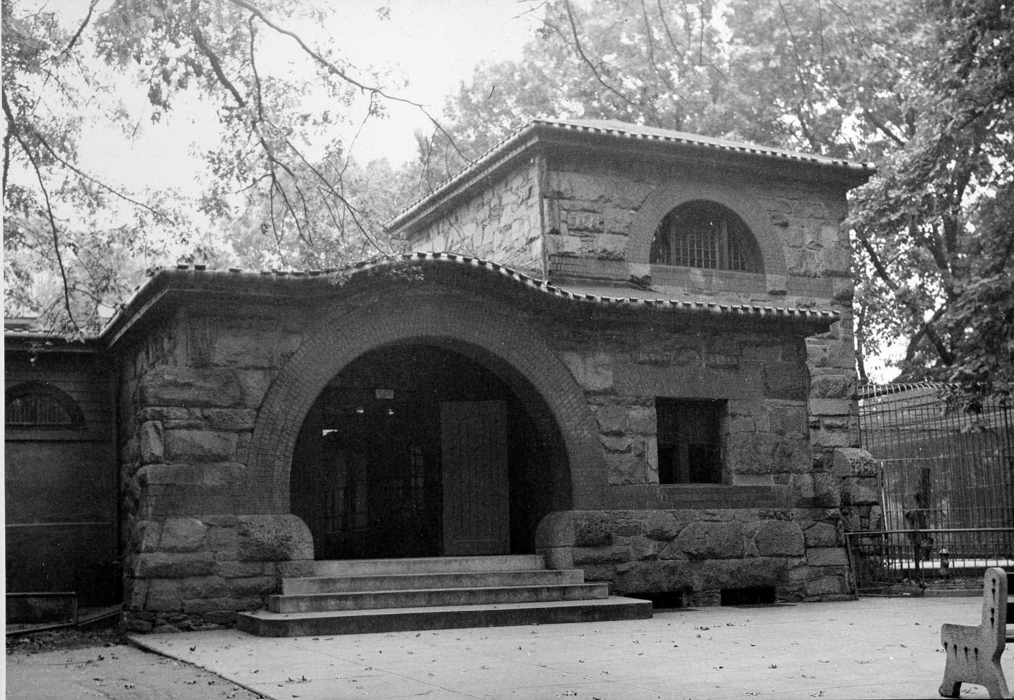The Lion House at the National Zoological Park. There is an outdoor cage next to the building.