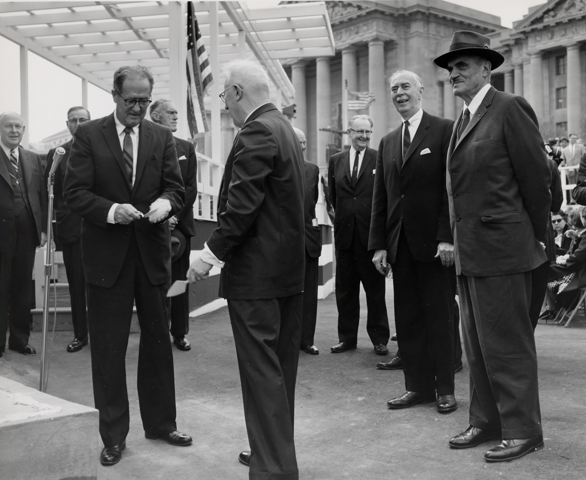 A group of unidentified men attend the laying of the cornerstone for the new National Museum of History and Technology, now the National Museum of American History, May 19, 1961. Smithsonian Secretary Leonard Carmichael is the second from the right.