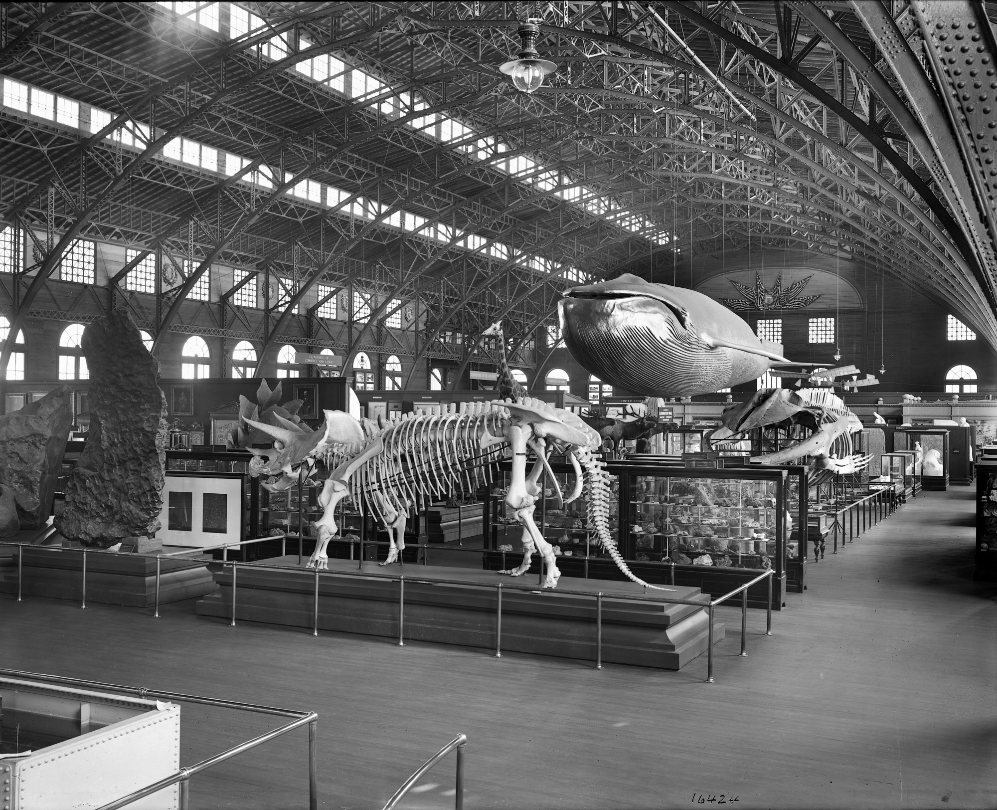 At the Louisiana Purchase Exposition in Saint Louis, Missouri, a view of the Natural History Fossil Exhibit with the model of a whale and skeletons of several dinosaurs. The Smithsonian coordinated all of the United States Government exhibits and prepared a display on its activities and collections for the exposition.