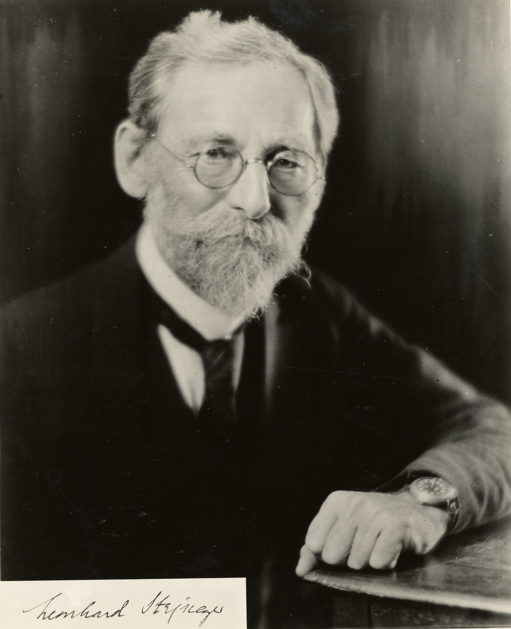 Leonhard Stejneger (1851-1943), ornithologist, herpetologist and zoologist, Head Curator of the Department of Biology and Curator of the Division of Reptiles and Batrachians. sits with his arm resting on a table.