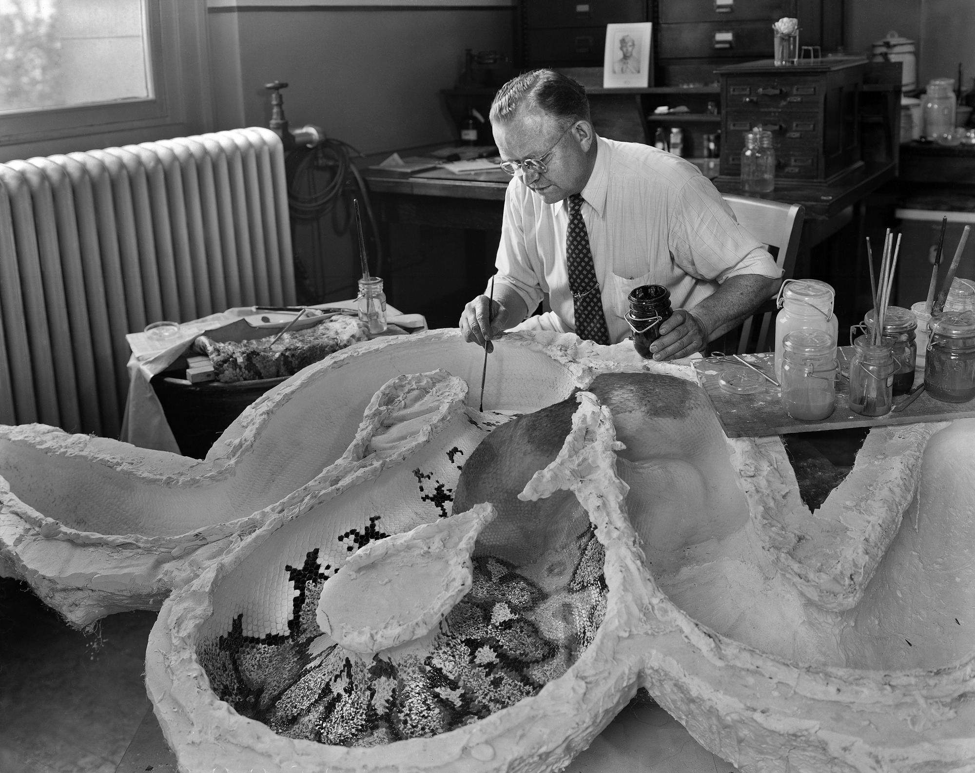 Edgar G. Laybourne, ?-1966, exhibits specialist, with the United States National Museum, prepares a model of a snake - a reticulated python - for display in the National Museum of Natural History. He is painting the snake's skin on the cast, which will later be removed.