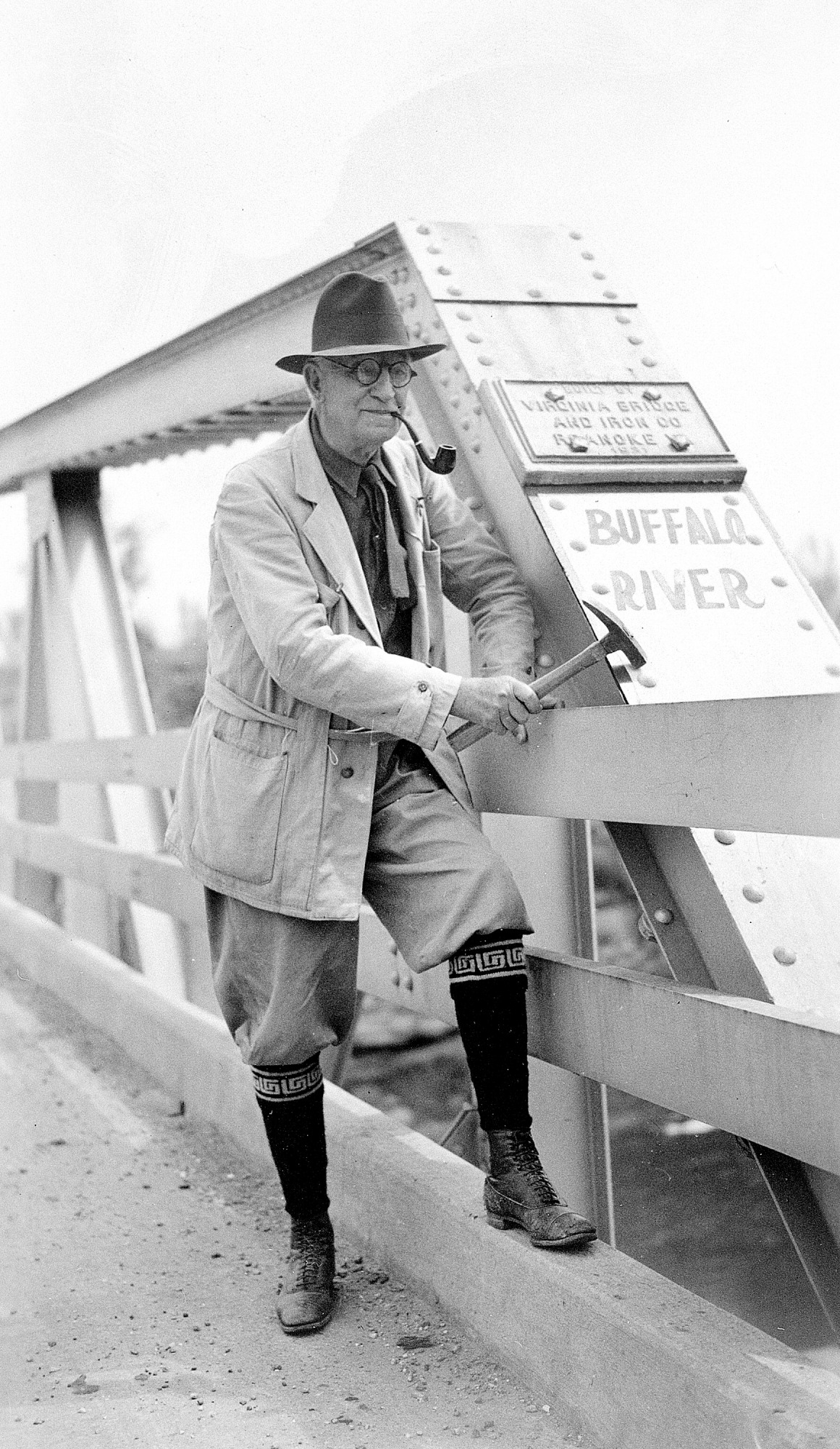 Edward Oscar Ulrich (1857-1944) stands on a bridge holding a geologist's hammer at Buffalo River, Arkansas. Ulrich was a geologist and an invertebrate paleontologist. He worked many years as a freelance geologist and paleontologist on many of the state geological surveys. He worked for the United States Geological Survey from 1897 to 1932. After retiring he continued to work on fossils and publications in an office in the United States National Museum, where he had held an honorary appointment since 1914.