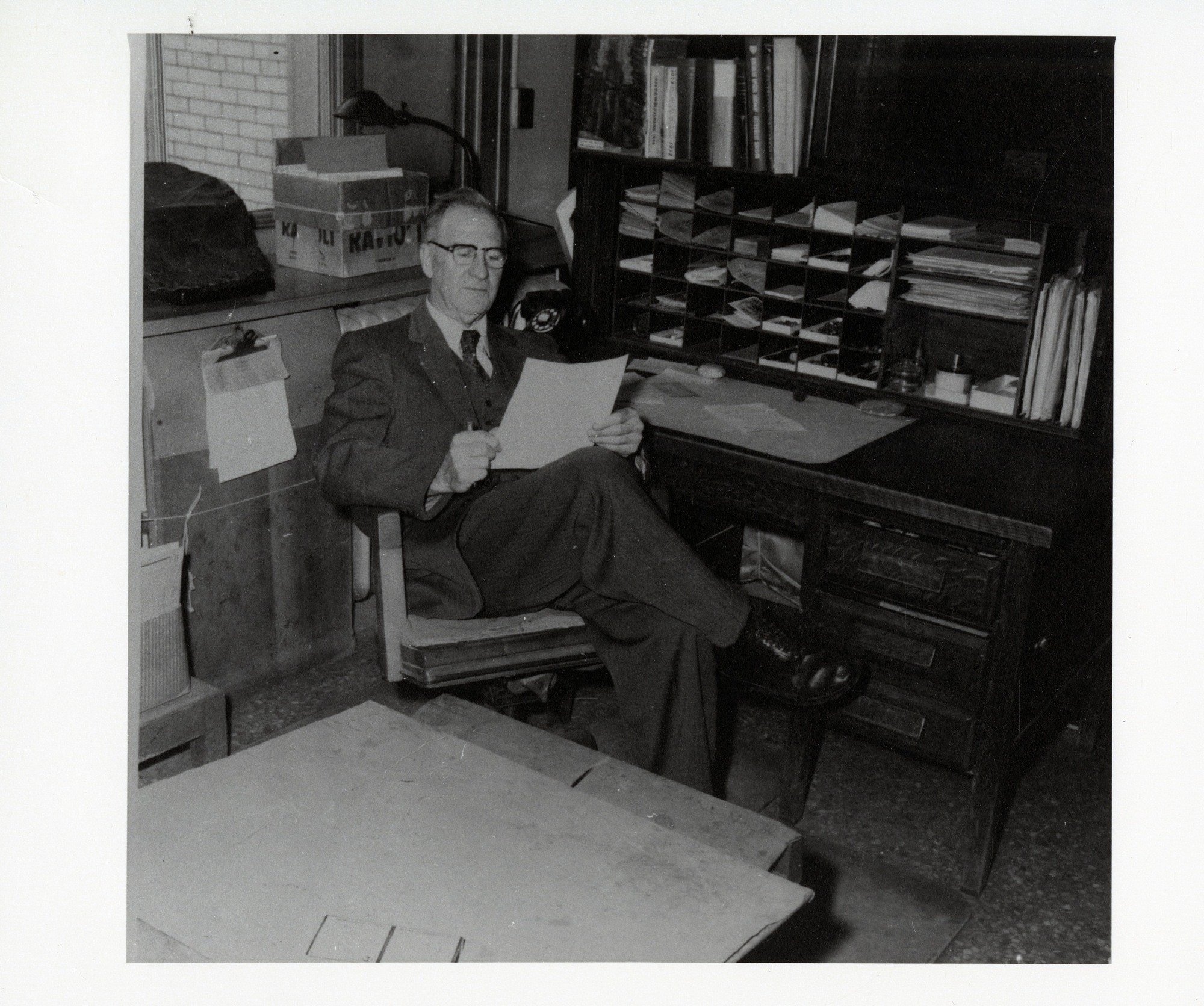 Roland W. (Roland Wilbur) Brown, 1893-1961, a paleobotanist, sits at his desk in "Stone Hall" at the National Museum of Natural History (NMNH). A very frugal man, above his desk are Sears Roebuck & Co. catalogues in which he pasted newspaper clippings of interest.