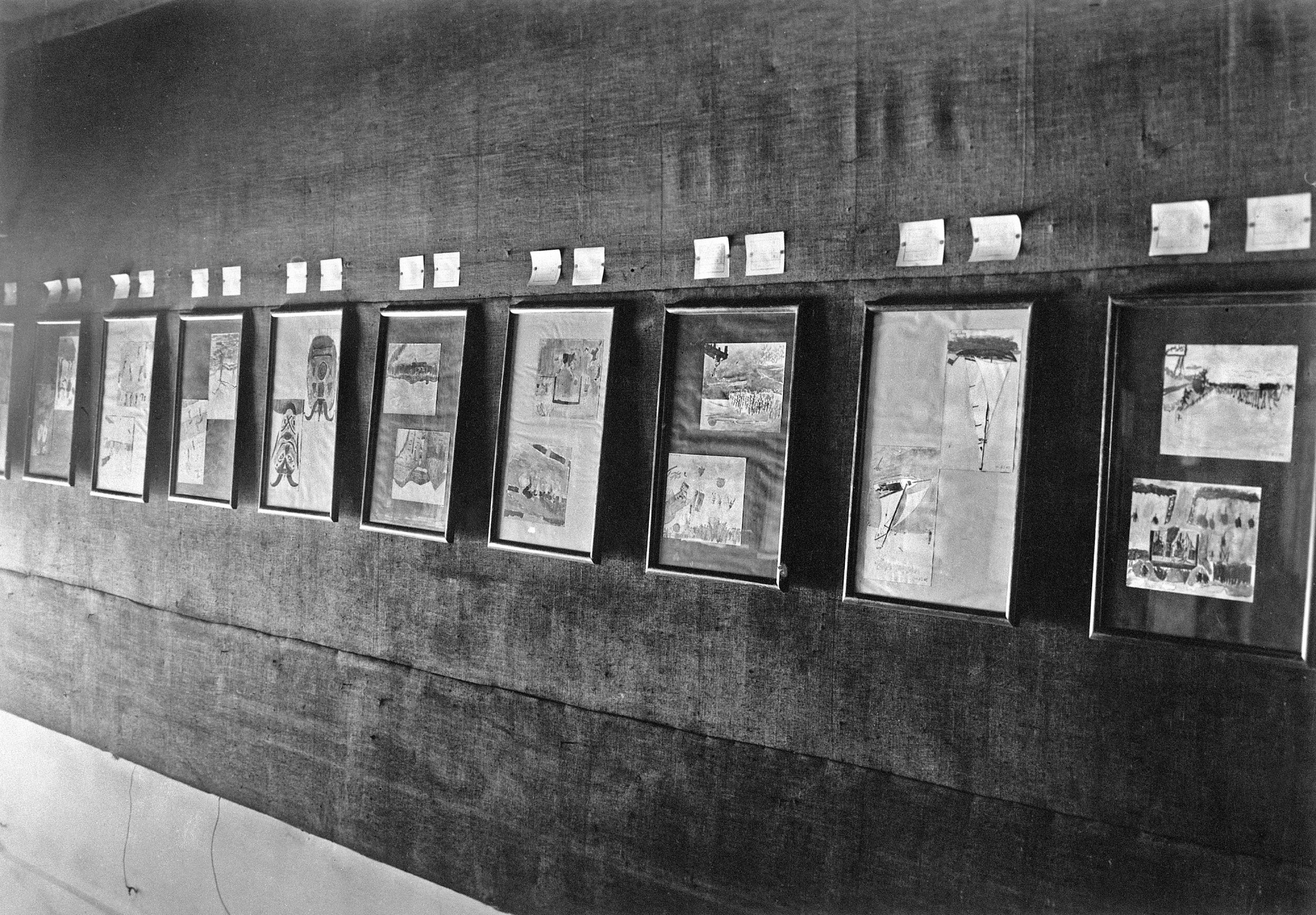 Exhibit of drawings by Japanese and American children, organized by Teiichi Kobayashi and Rebecca Henderson, wife of Edward P. Henderson, at the Transportation Museum, Tokyo. Edward Henderson was curator of meteorites at the United States National Museum and traveled to post-war Japan to appraise gem collections for the United States Army.
