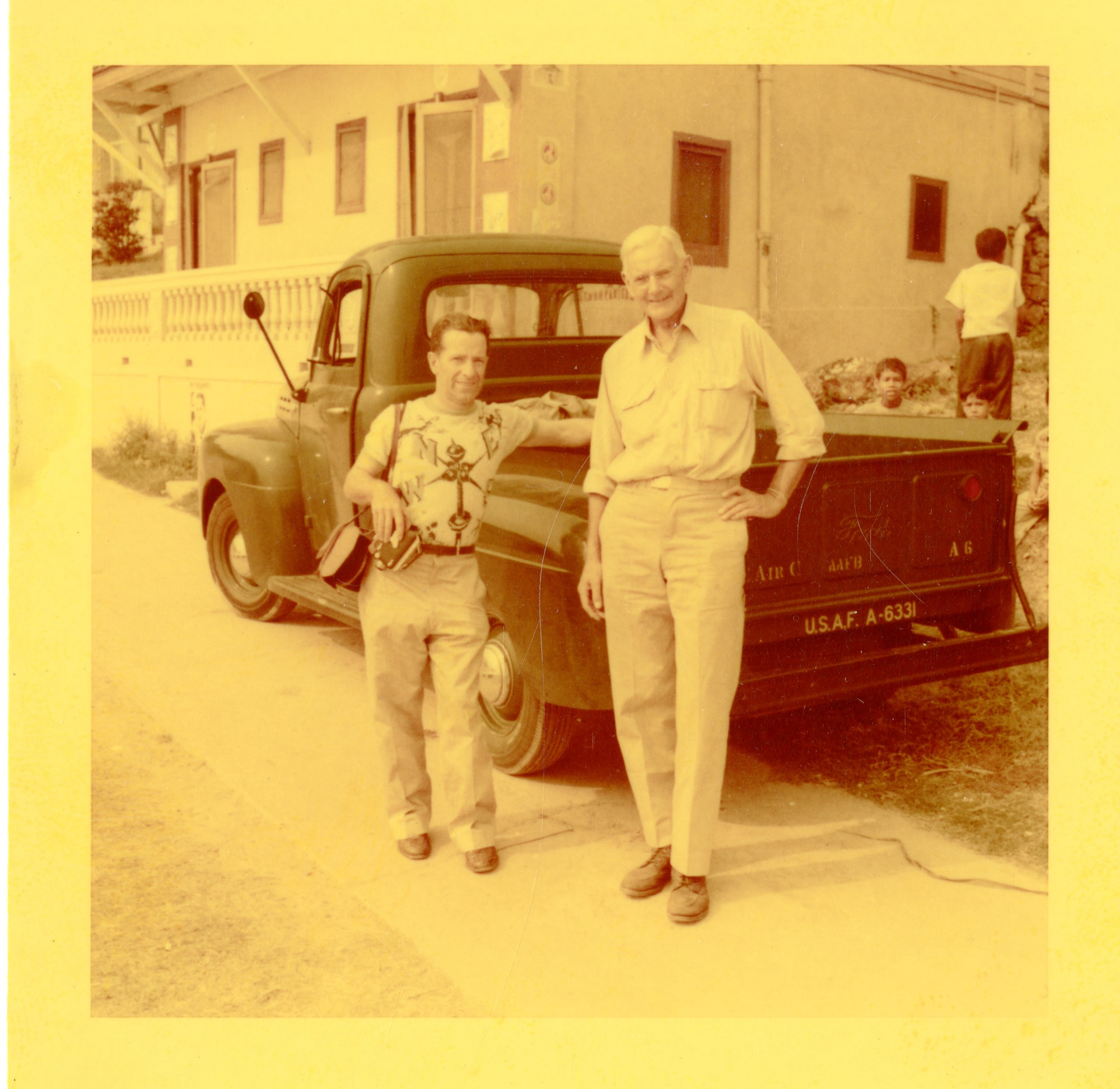 Watson M. Perrygo, taxidermist, exhibits preparator and zoological exhibits worker in the Department of Zoology, United States National Museum, and Alexander Wetmore, ornithologist and sixth Secretary of Smithsonian, stand beside a truck carrying the identification of the United States Air Force (U.S.A.F. A-6331). They are on Taboga Island, Panama. Perrygo and Wetmore went on many trips to collect bird specimens.