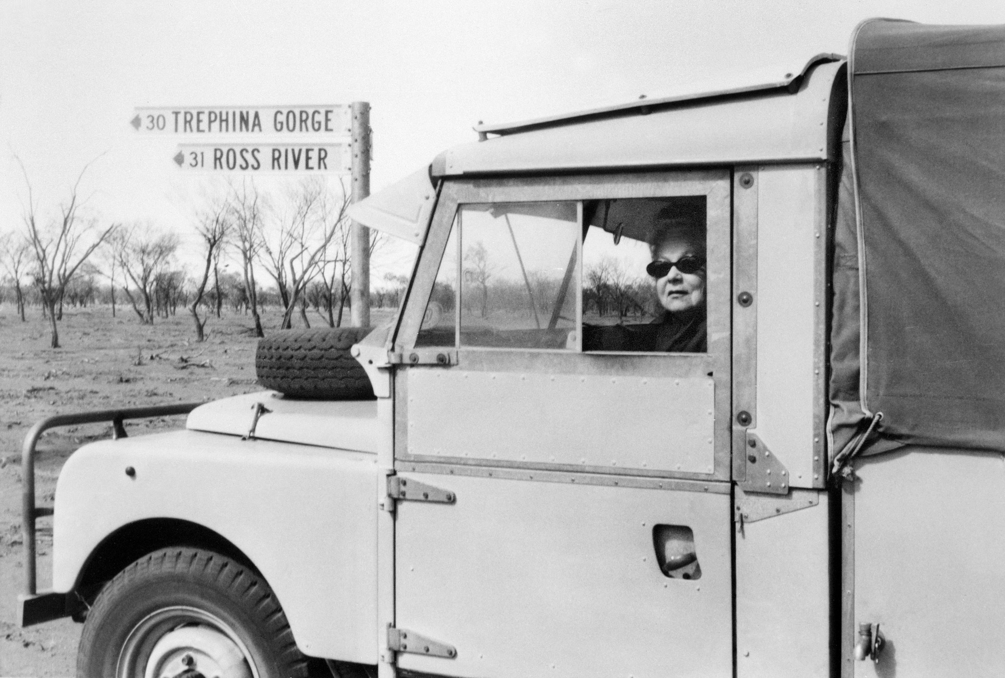 Rebecca Henderson, wife of Edward P. Henderson, Curator in the Department of Geology at the National Museum of Natural History, accompanied her husband on his trip to Australia to collect meteorites. She sits in a land vehicle named Rockhound I near Undoolya Gap in Central Australia.
