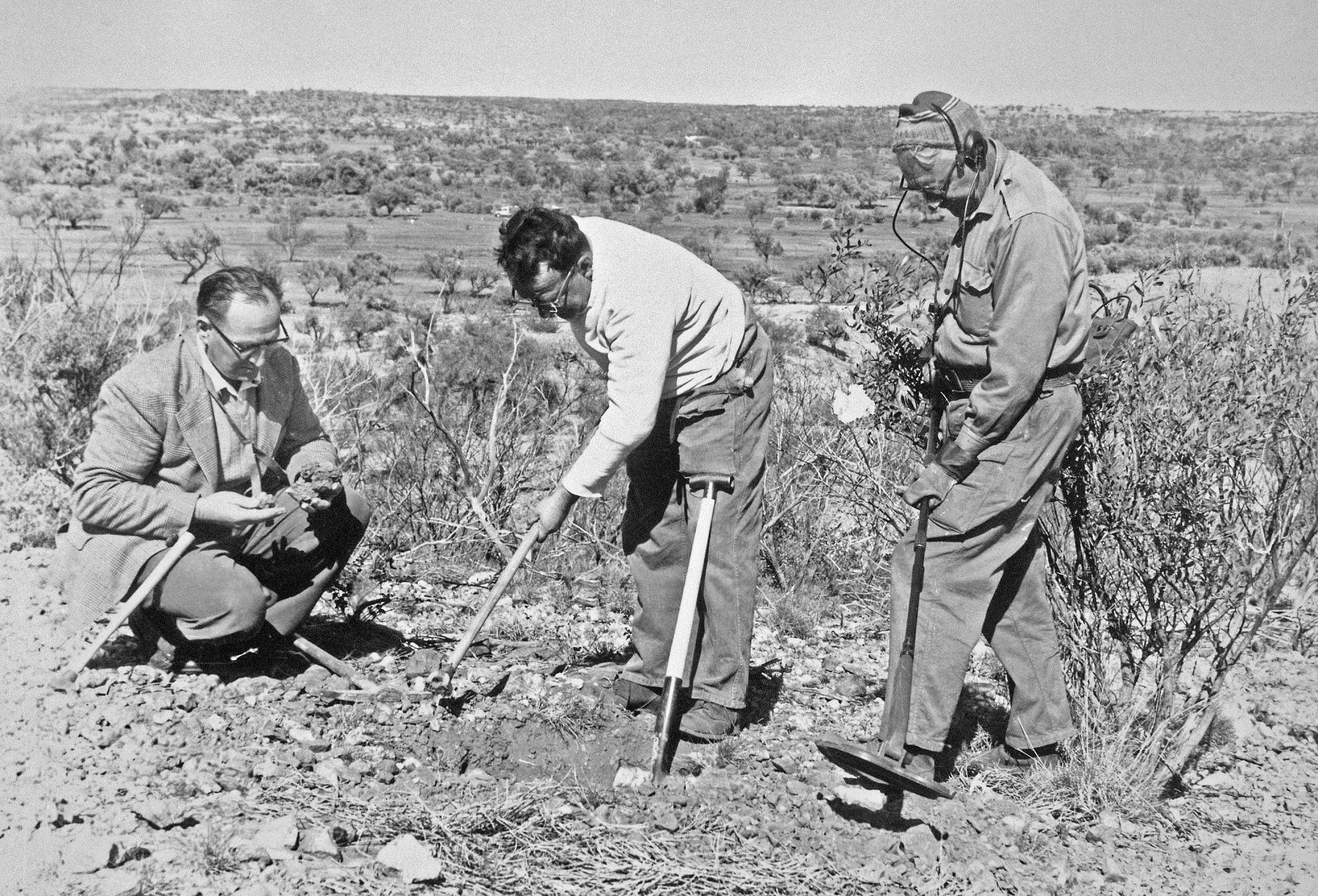 From L. to R.: Douglas Boerner, Oliver Chalmers; and Edward P. Henderson are prospecting with metal detectors in Henbury, Australia, location of the Henbury Crater. Edward P. Henderson, following his retirement as Curator of the Division of Meteorites in the Department of Mineral Sciences at the National Museum of Natural History, made a trip to Australia to gather meteorites.