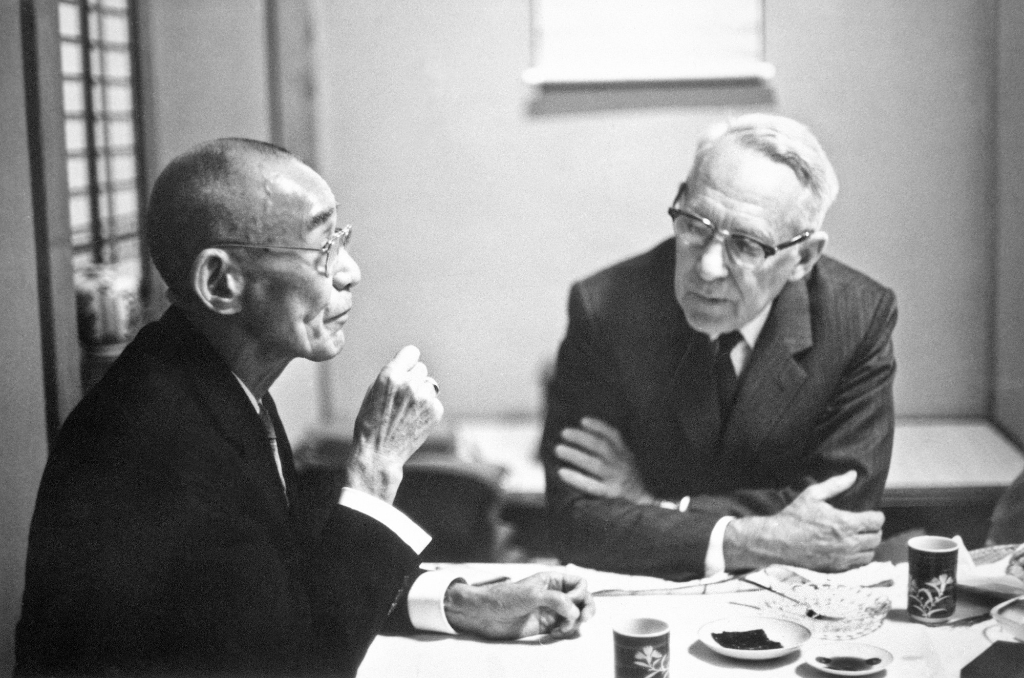 Edward P. Henderson and Kikuo Suwa's father seated at a table in Suwa's house. Edward P. Henderson made several trips to Japan to appraise gems confiscated by the Japanese government during World War II. Henderson (1898-1992) was Curator of Mineral Sciences at the National Museum of Natural History.