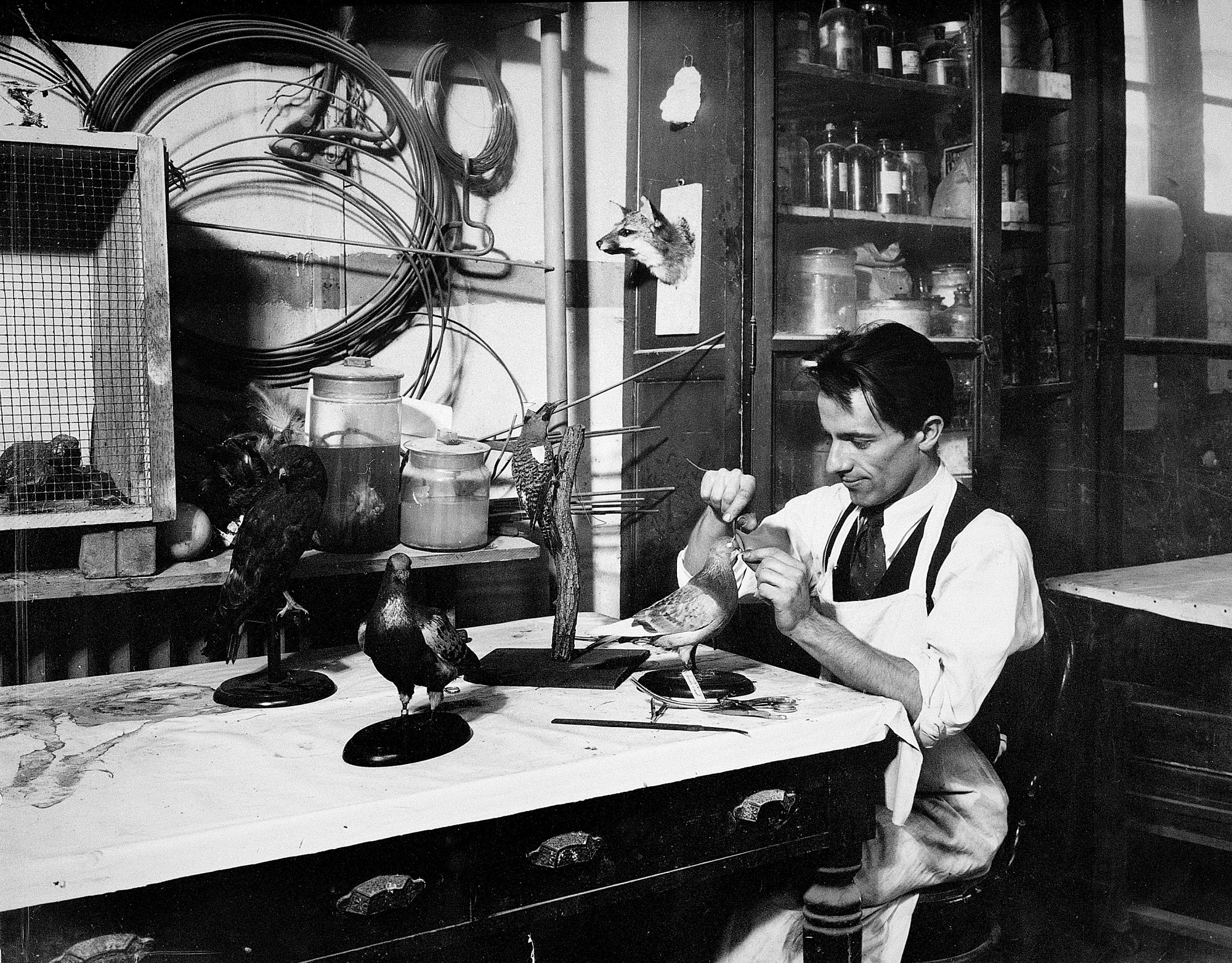 Watson M. (Watson Mondell) Perrygo (1906-1984) sits at a table in the United States National Museum (USNM) Taxidermy Studio working on a bird specimen for exhibition. Perrygo began his career at the USNM, now the National Museum of Natural History, in 1927 as a scientific aide in the Division of Mammals and the taxidermy studio. In addition to the taxidermic and other collection-related work, Perrygo was sent on field trips to collect birds, mammals, and snakes unrepresented in the USNM. Iguanas, from the Parish-Smithsonian Expedition to Haiti in 1930, can be seen in a cage at left.