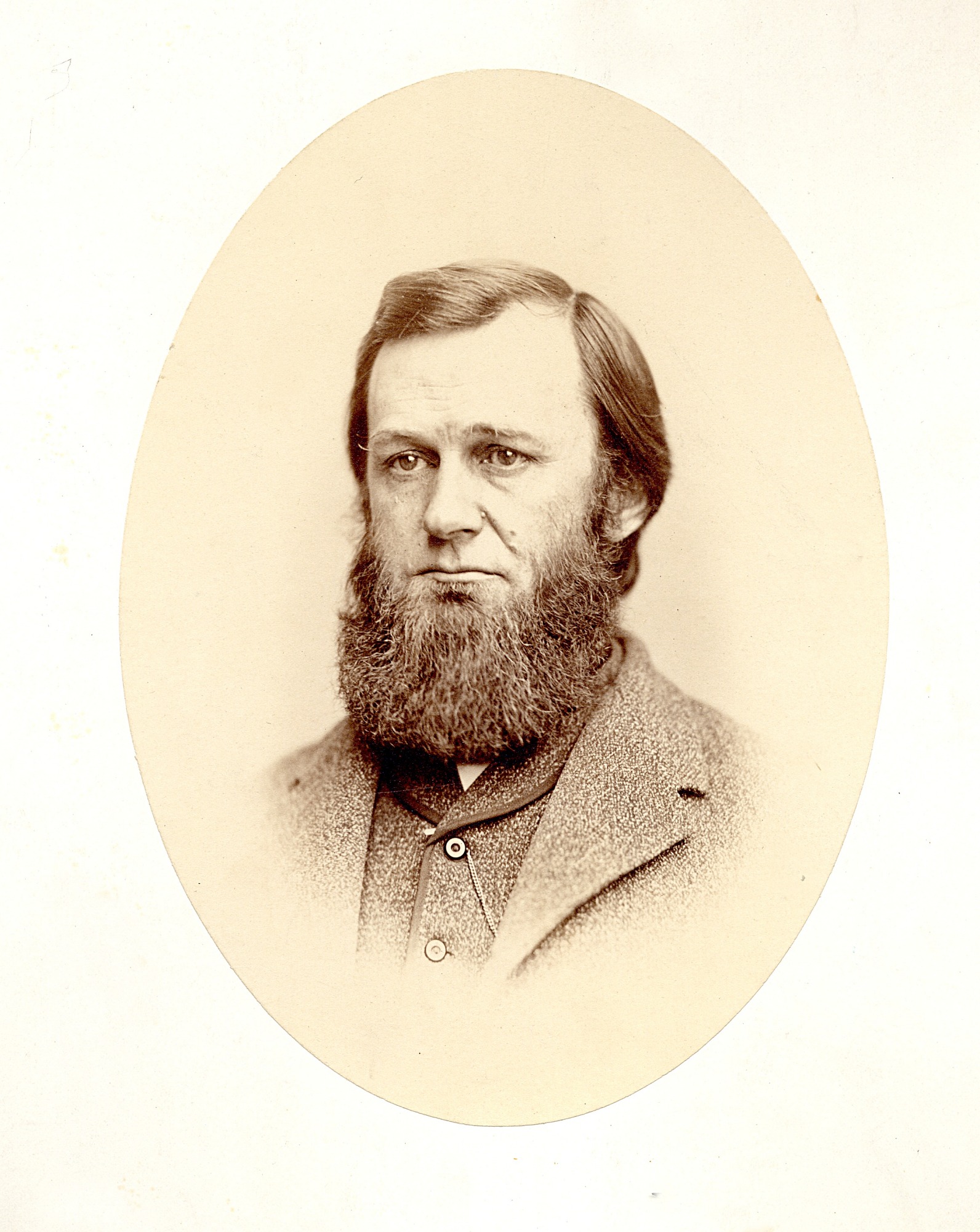 Portrait of Spencer Fullerton Baird (1823-1887), second Secretary (1878-1887) of the Smithsonian Institution. Baird, an ornithologist, arrived in Washington in 1850 to become Assistant Secretary of the Smithsonian Institution, a post he held for 28 years. Upon the death of Joseph Henry, the first Secretary of the Smithsonian (1847-1878), he became Secretary. In this image Baird is facing more forward and only slightly looking to the right. Baird noted in his desk diary that William Bell came to photograph him on January 10, 1867.